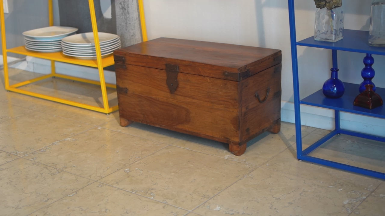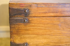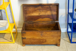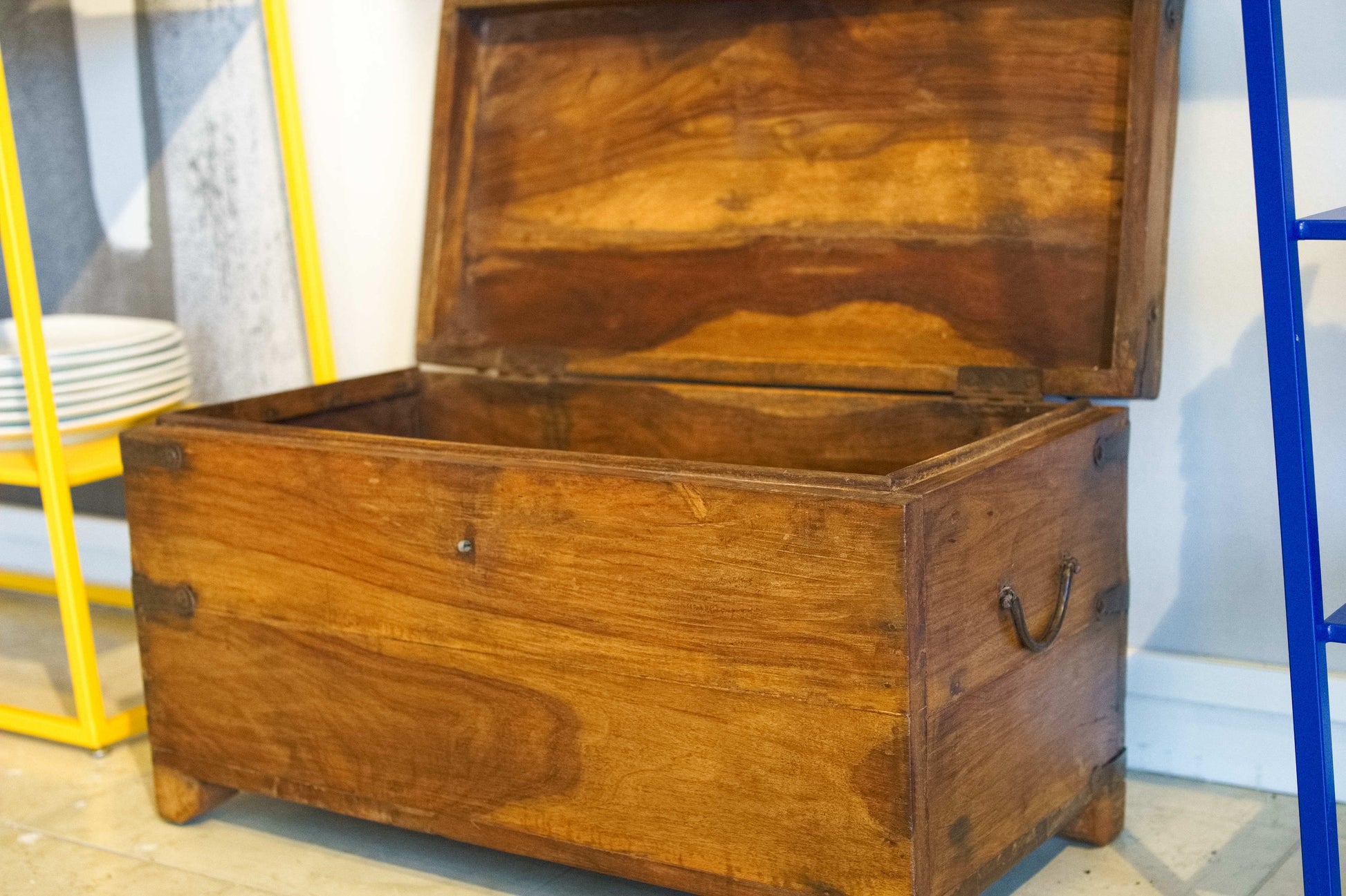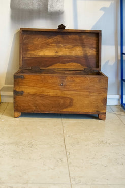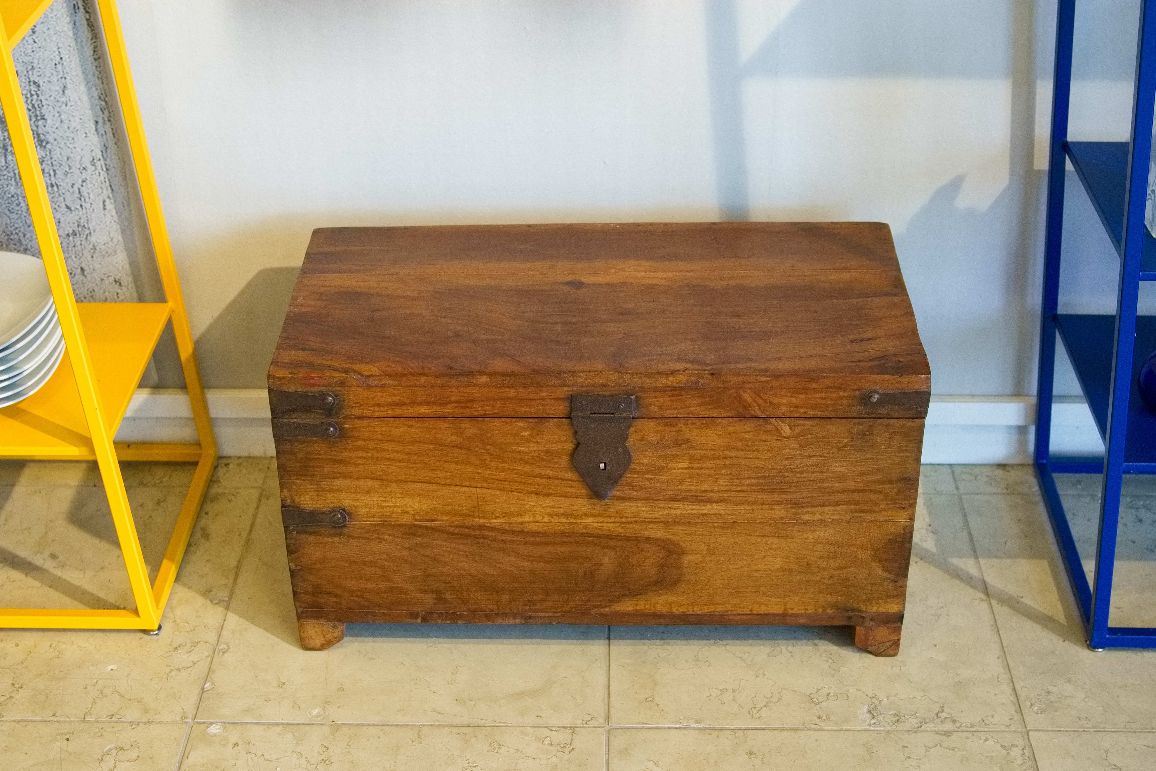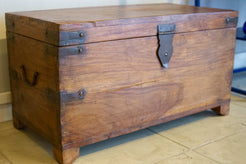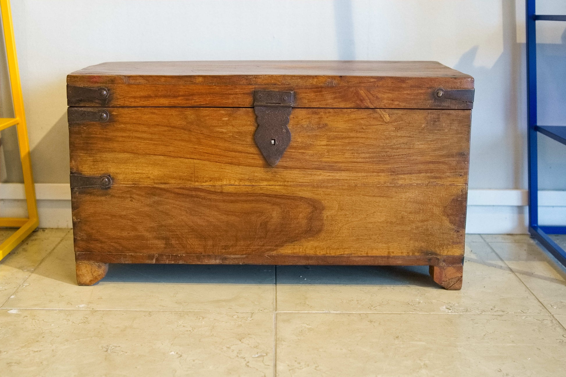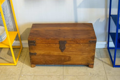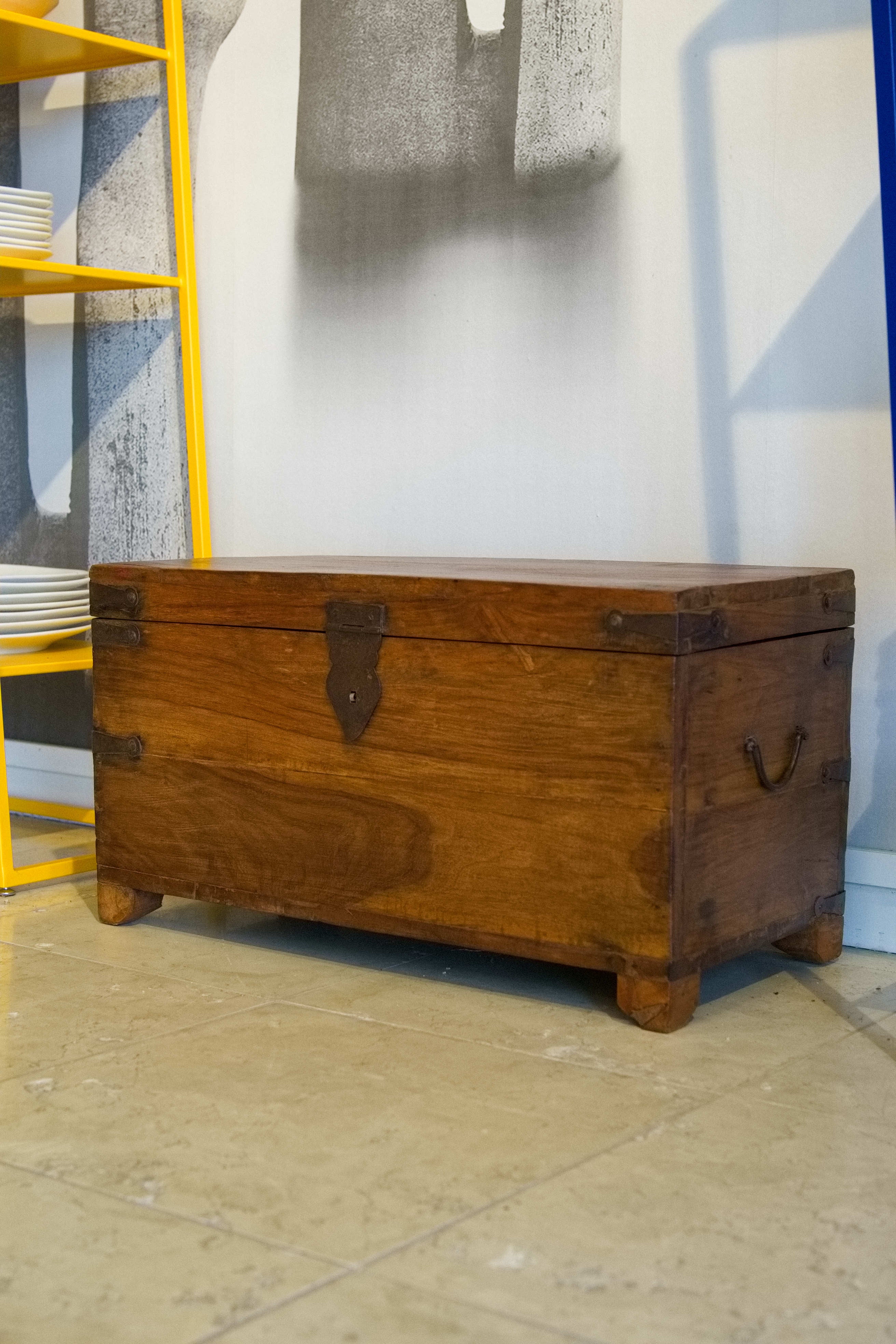 Baule Indiano in legno di teak con rinforzi laterali in metallo.