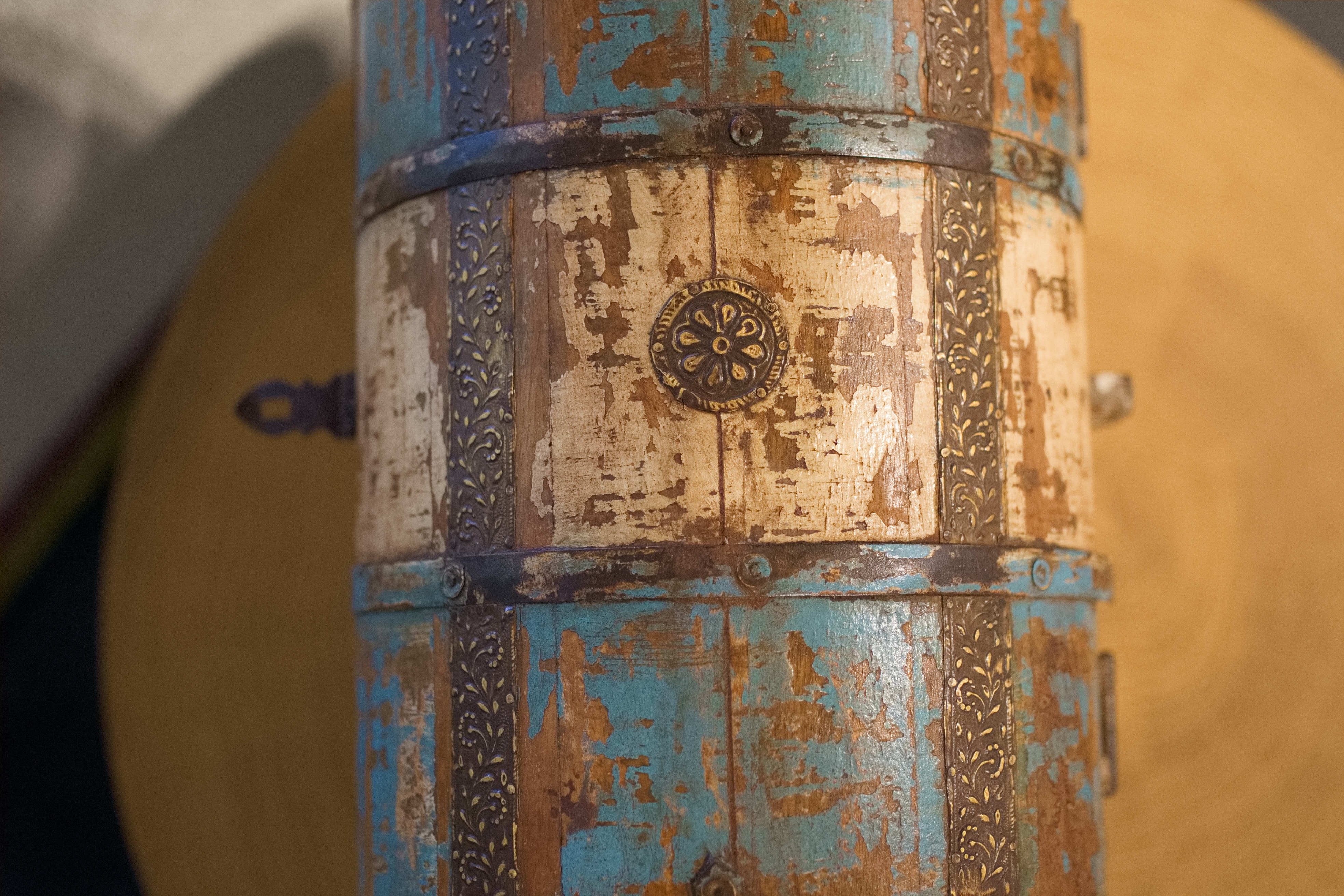 portabottiglie in metallo lavorato e legno laccato