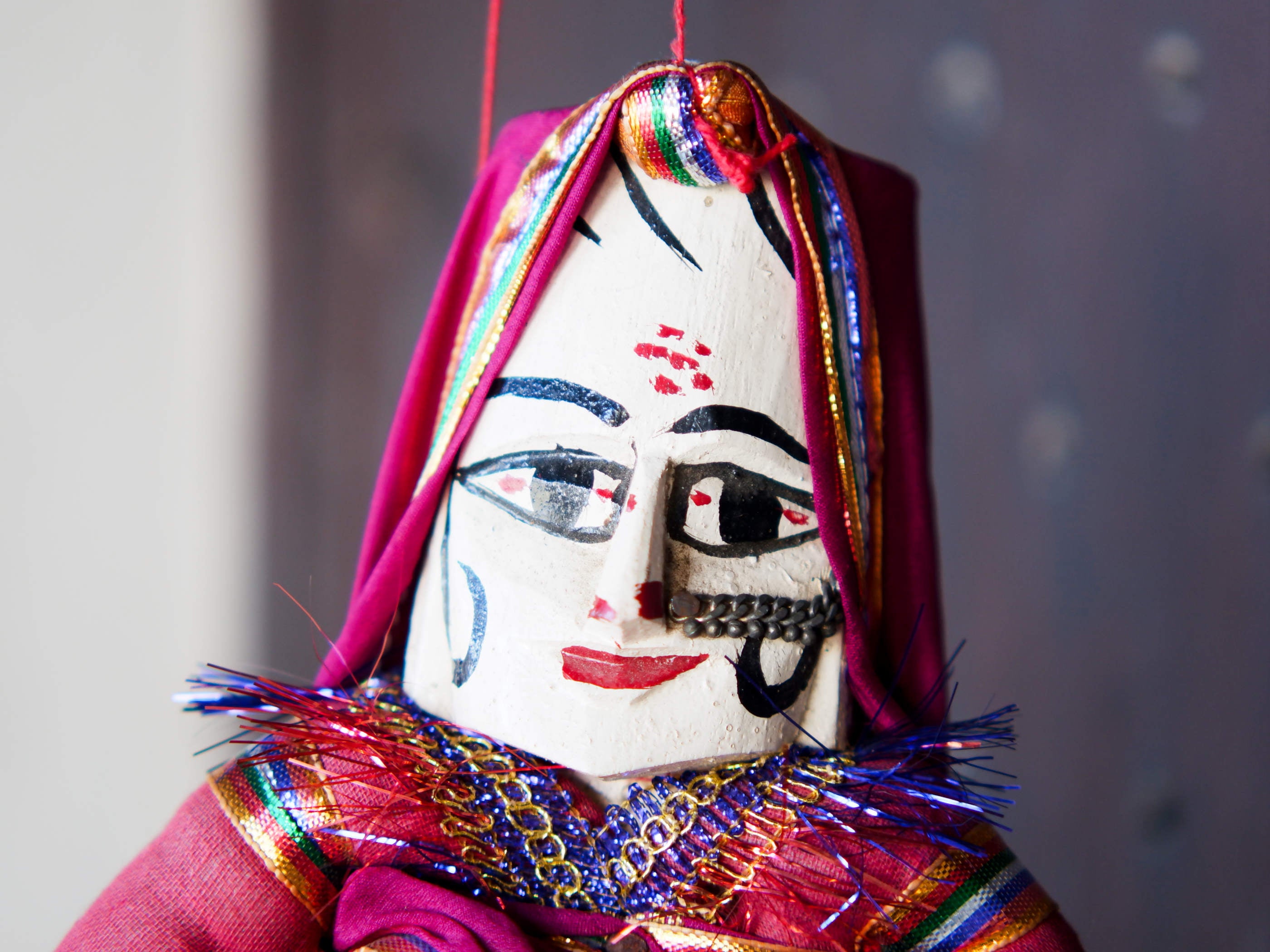 burattini tradizionali indiani in tessuto. dotati di corde sulla testa e sulle mani per appendere e/o manipolare. fatti a mano.
