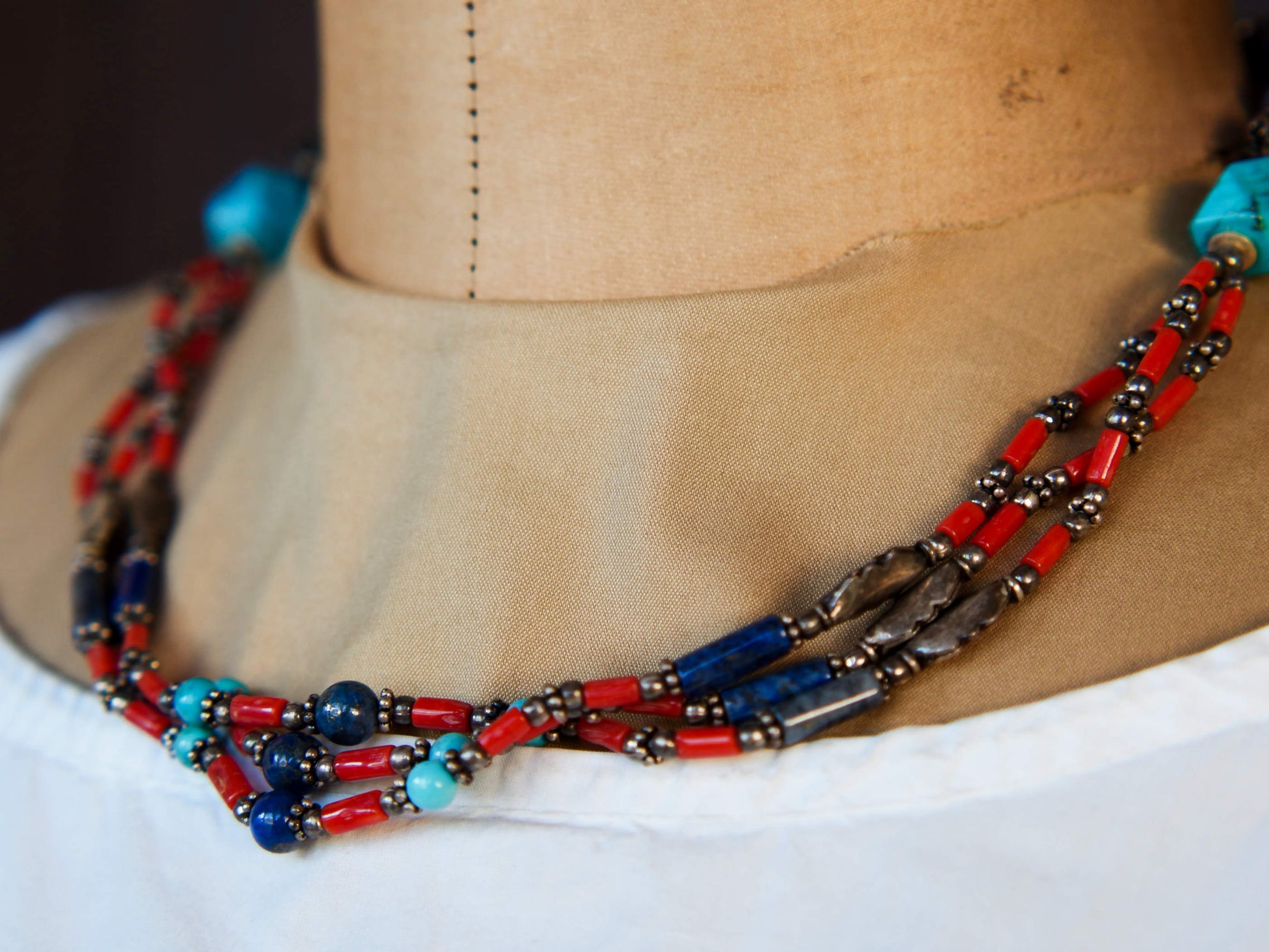 collana nepalese / tibetana con lapislazzulo, corallo, turchese e argento no pasta ma pietre vere non tinte o modificate nel colore, qualità top. assemblata artigianalmente, pezzo unico.