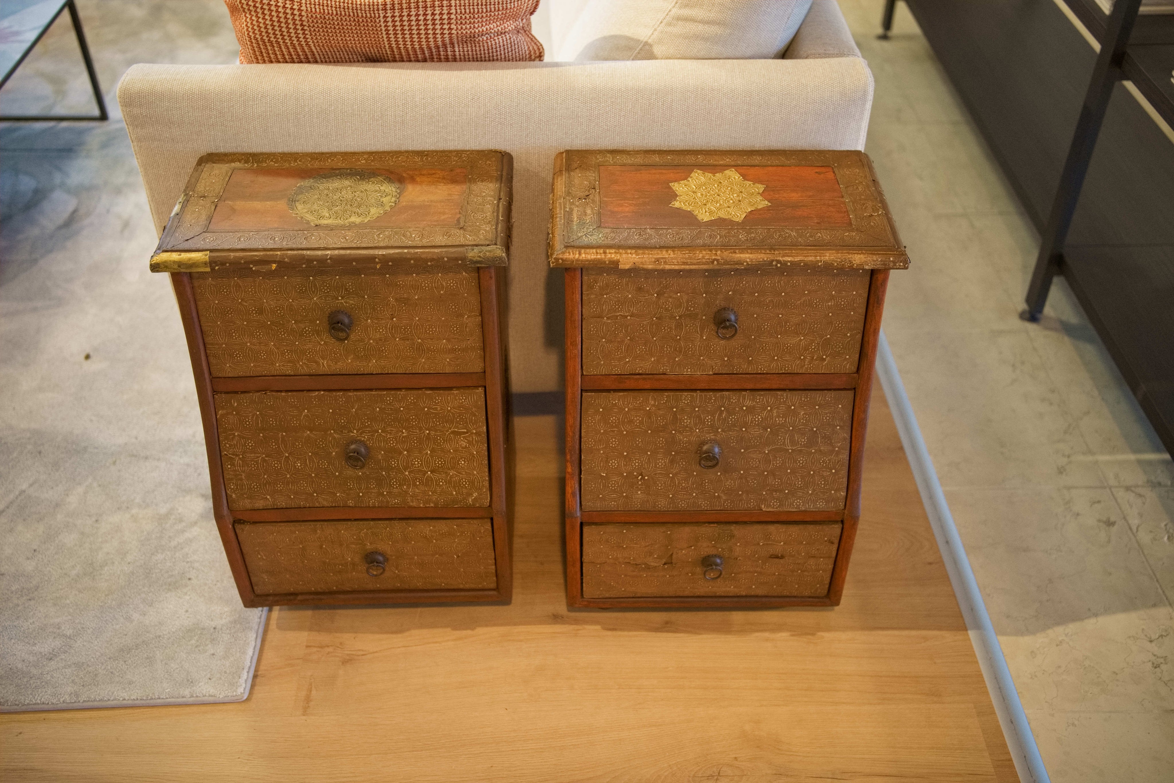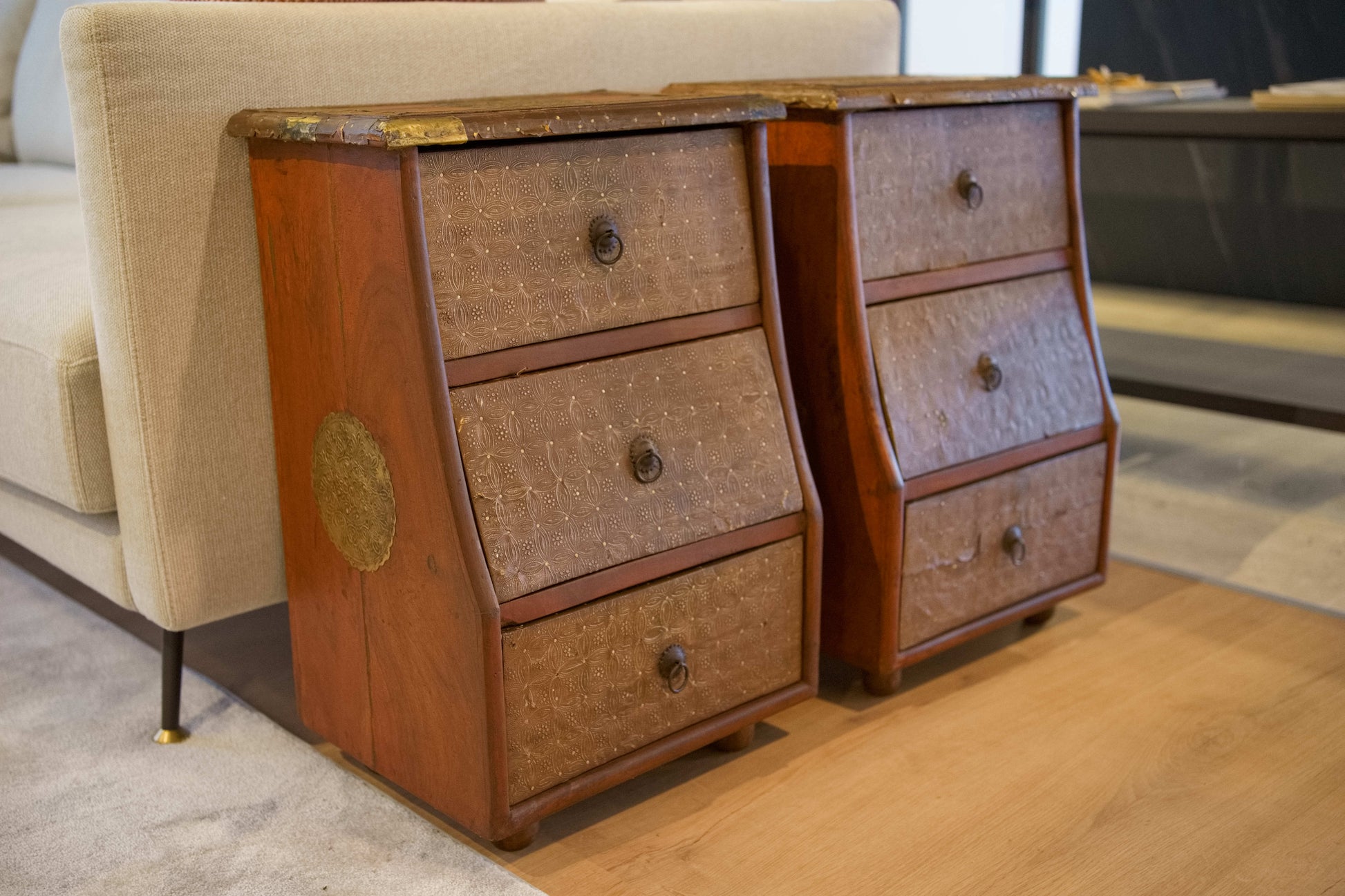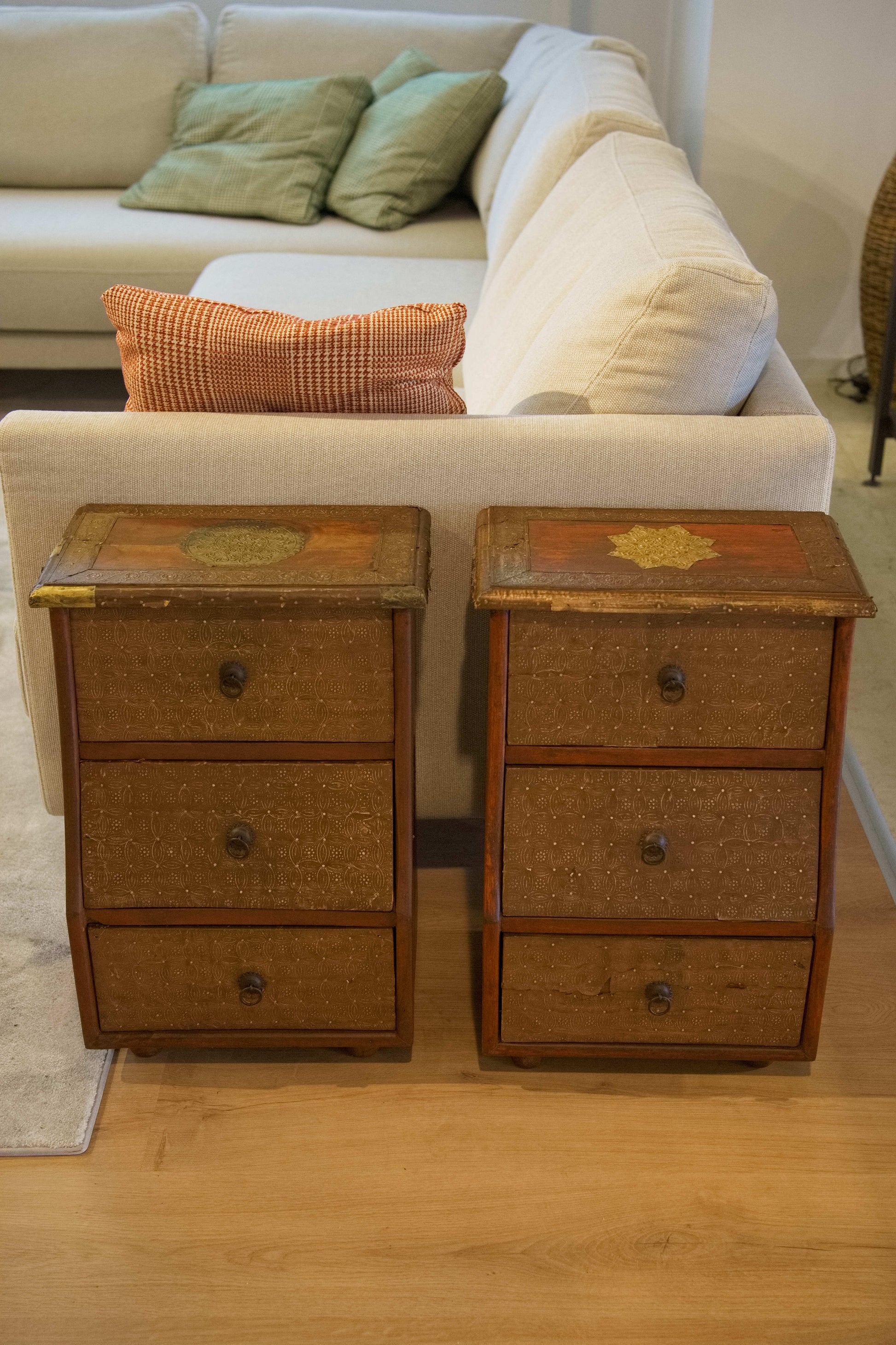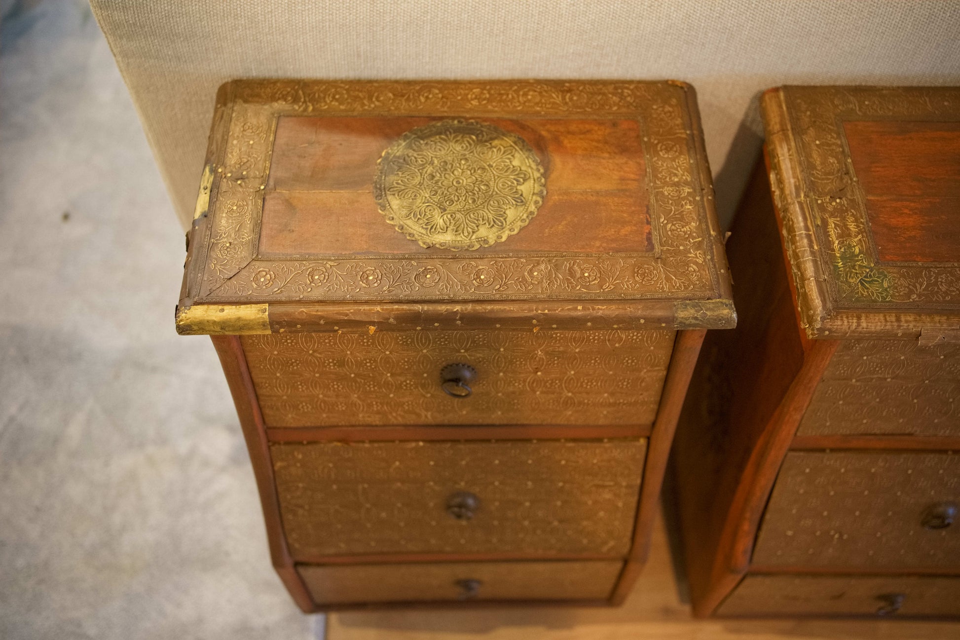 mobile indiano 3 cassetti costruito in legno di teak mobile decorato a rilievo con elementi in metallo