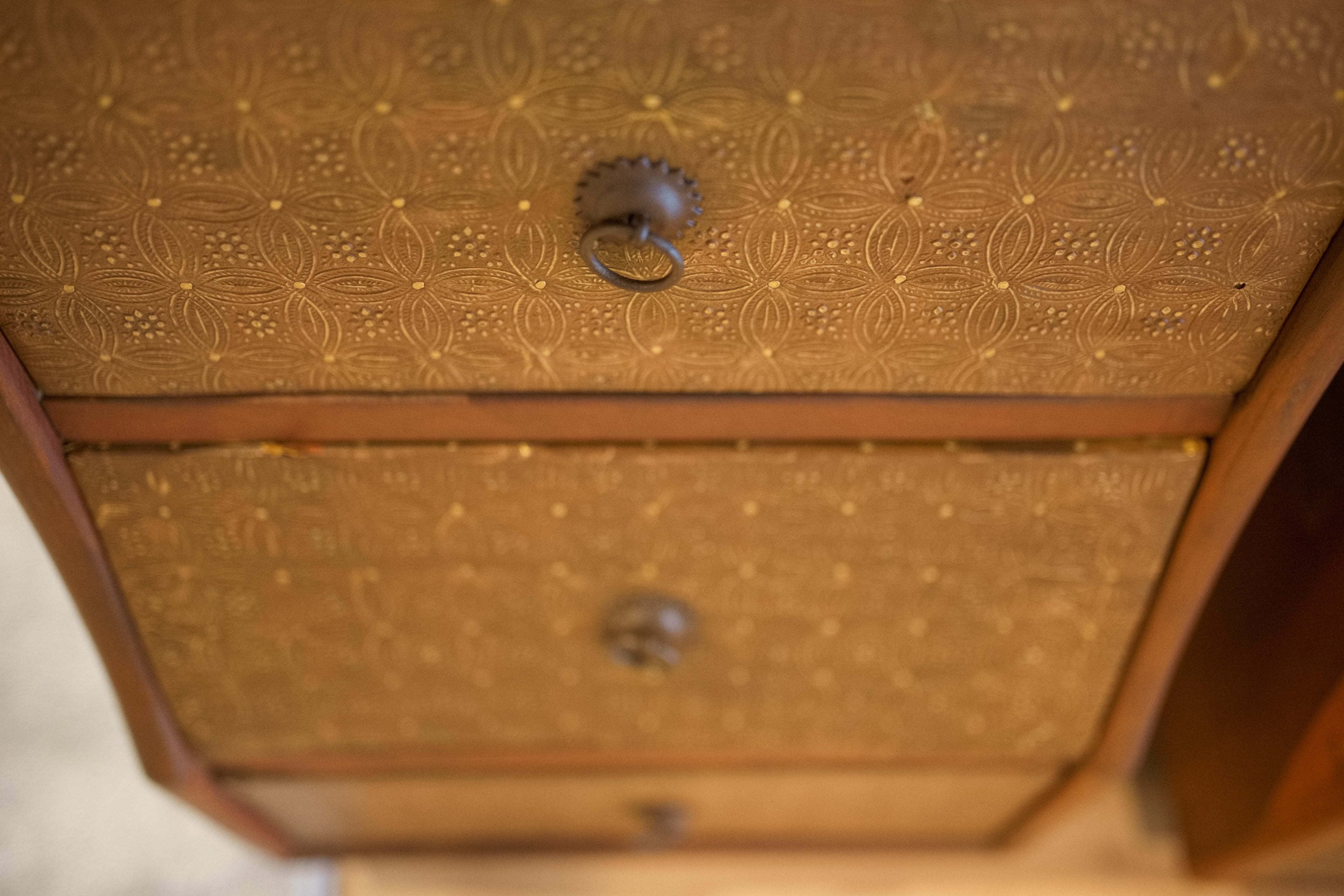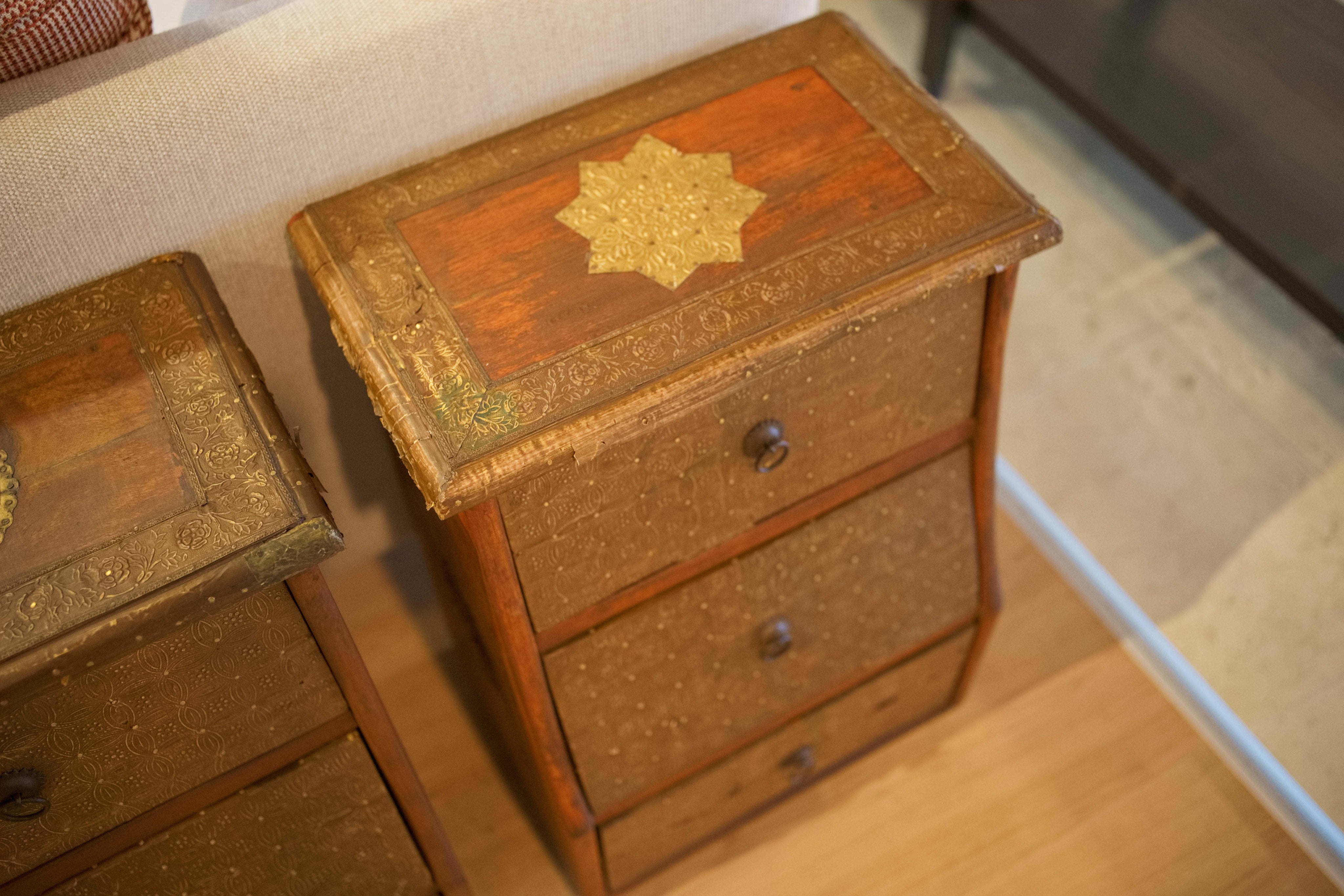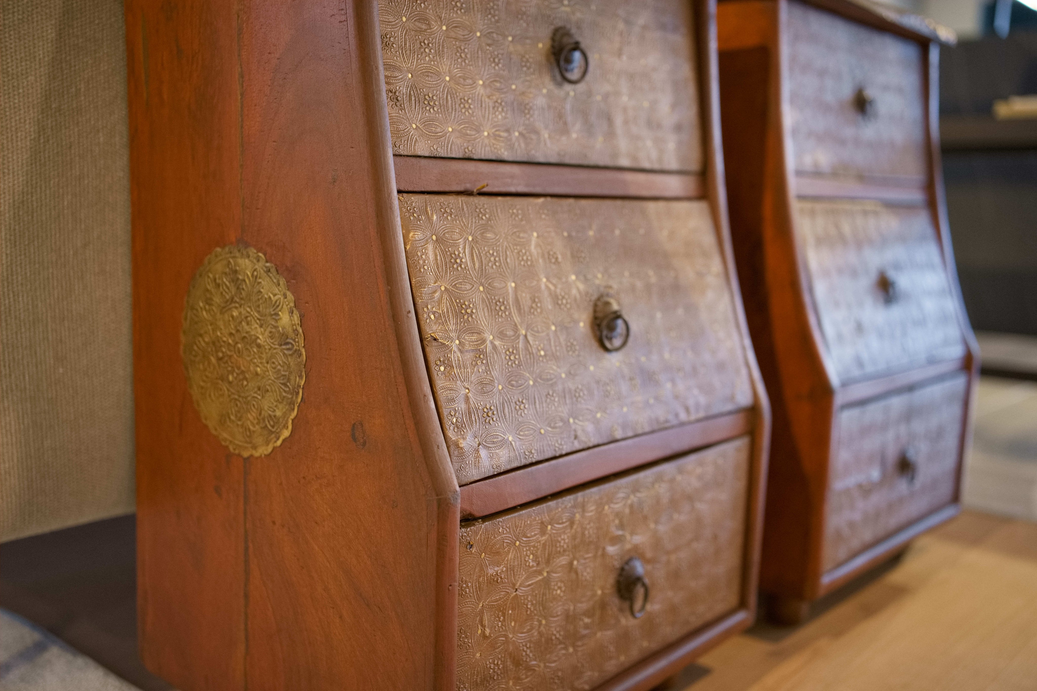 mobile indiano 3 cassetti costruito in legno di teak mobile decorato a rilievo con elementi in metallo