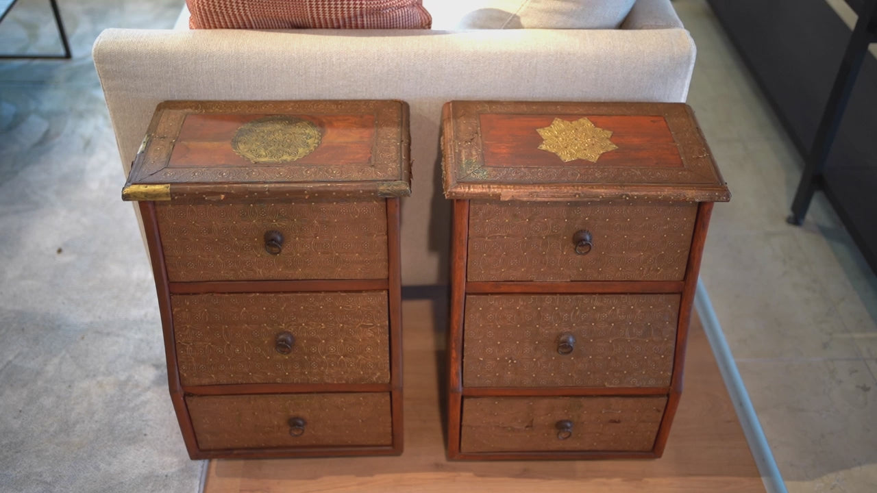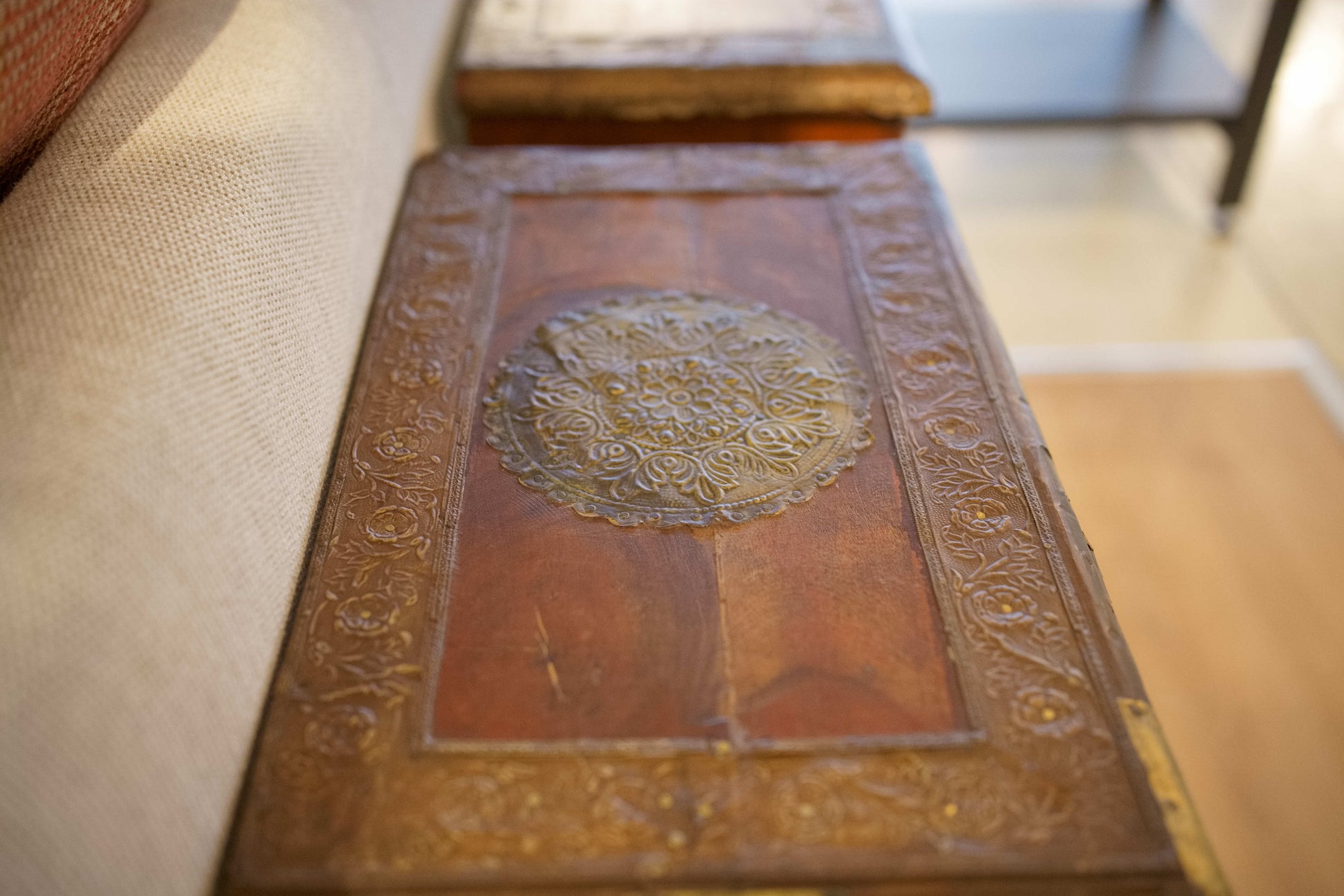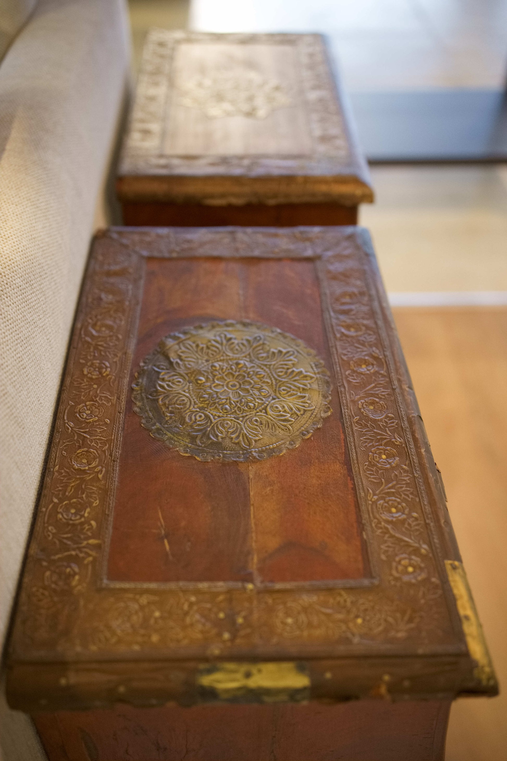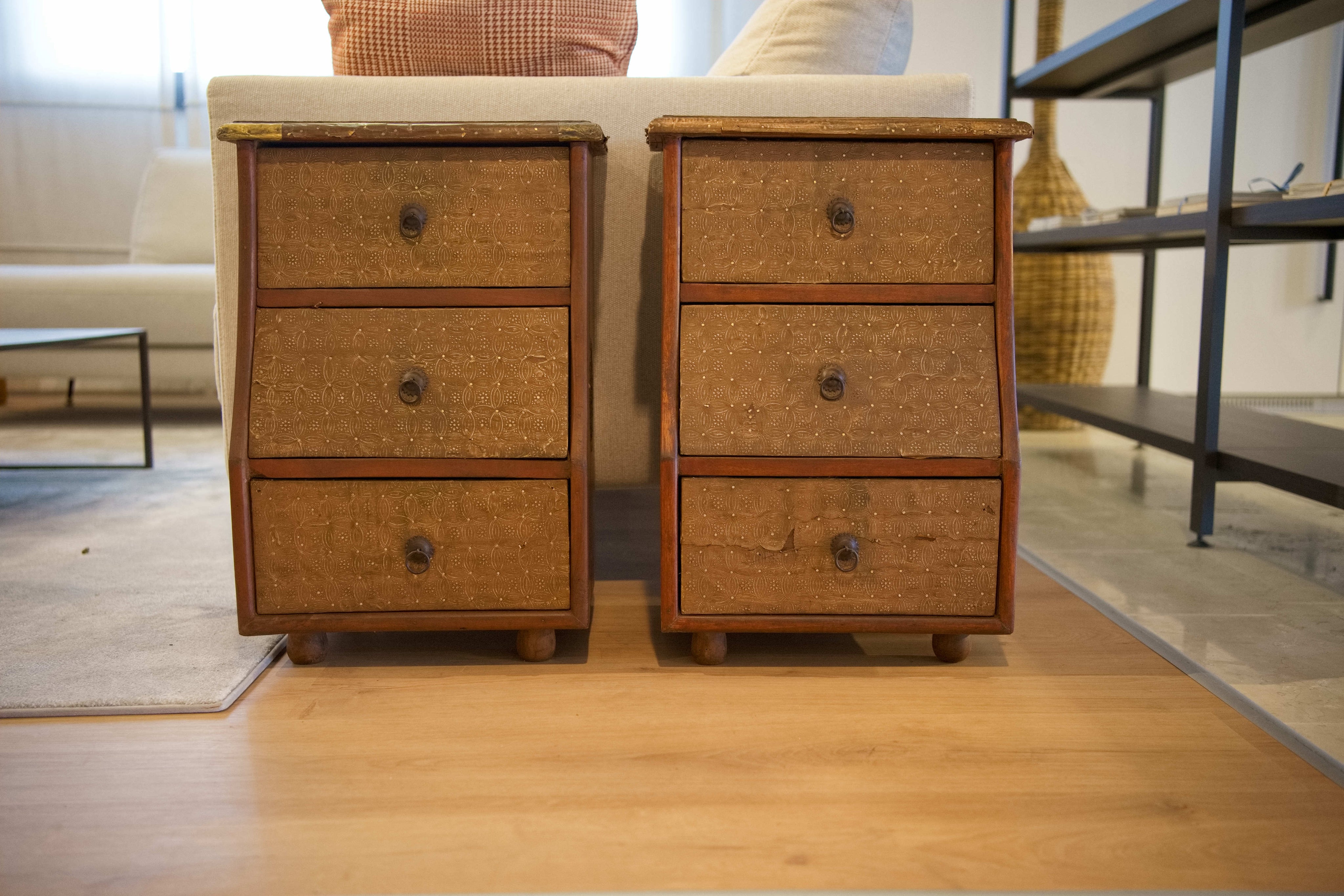 mobile indiano 3 cassetti costruito in legno di teak mobile decorato a rilievo con elementi in metallo