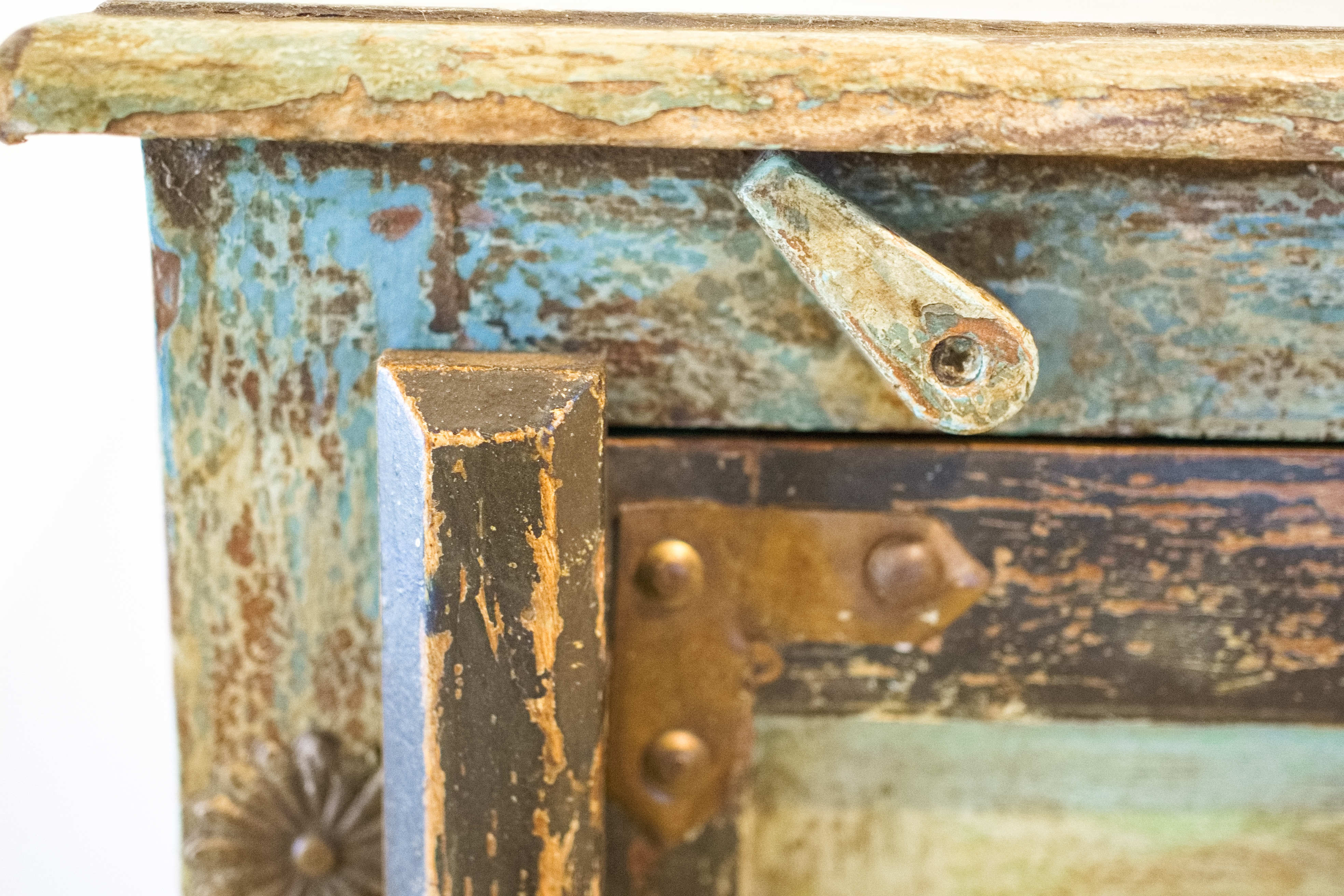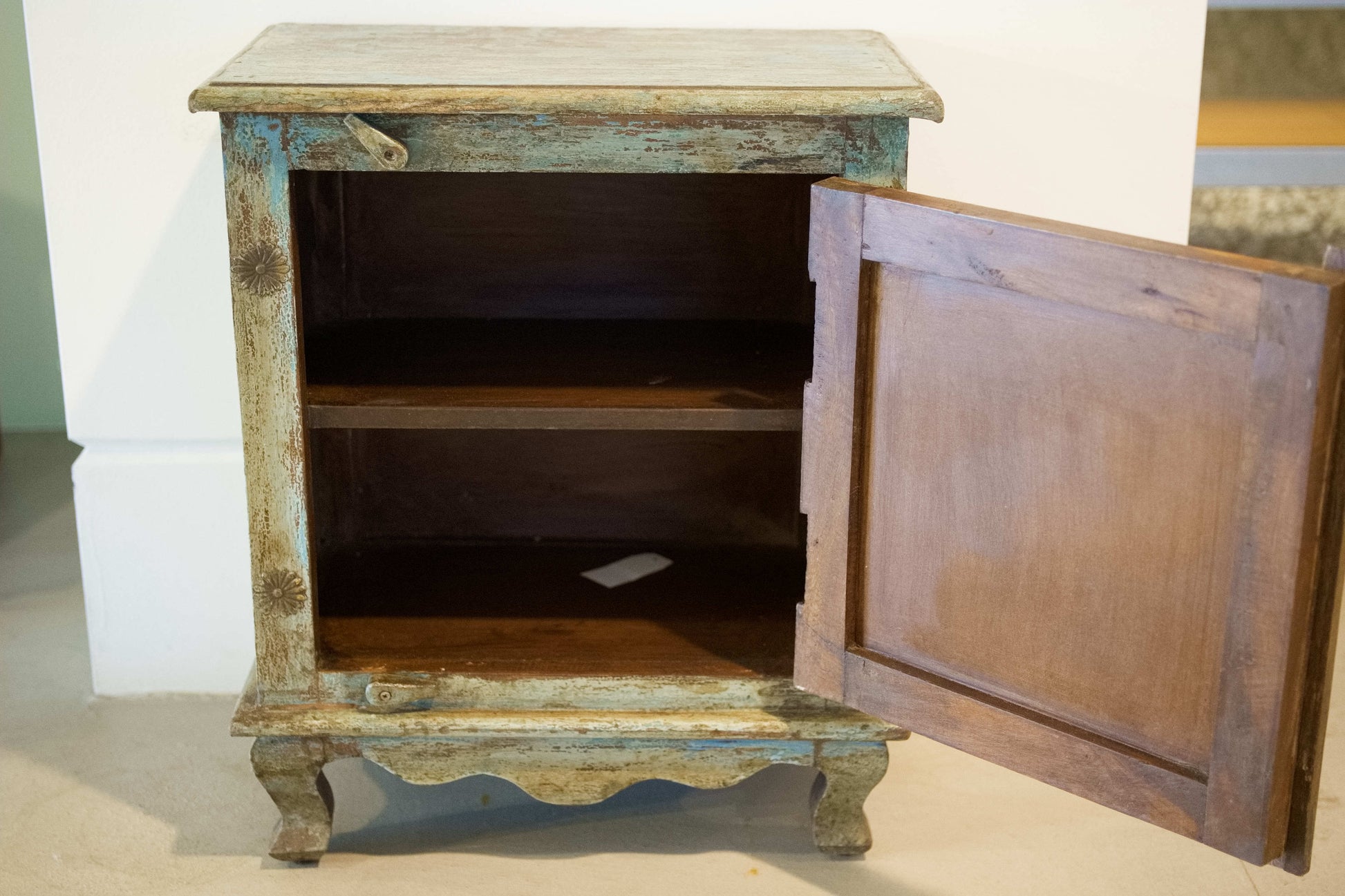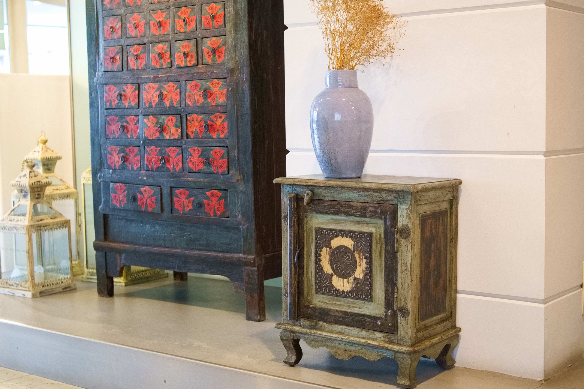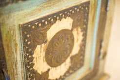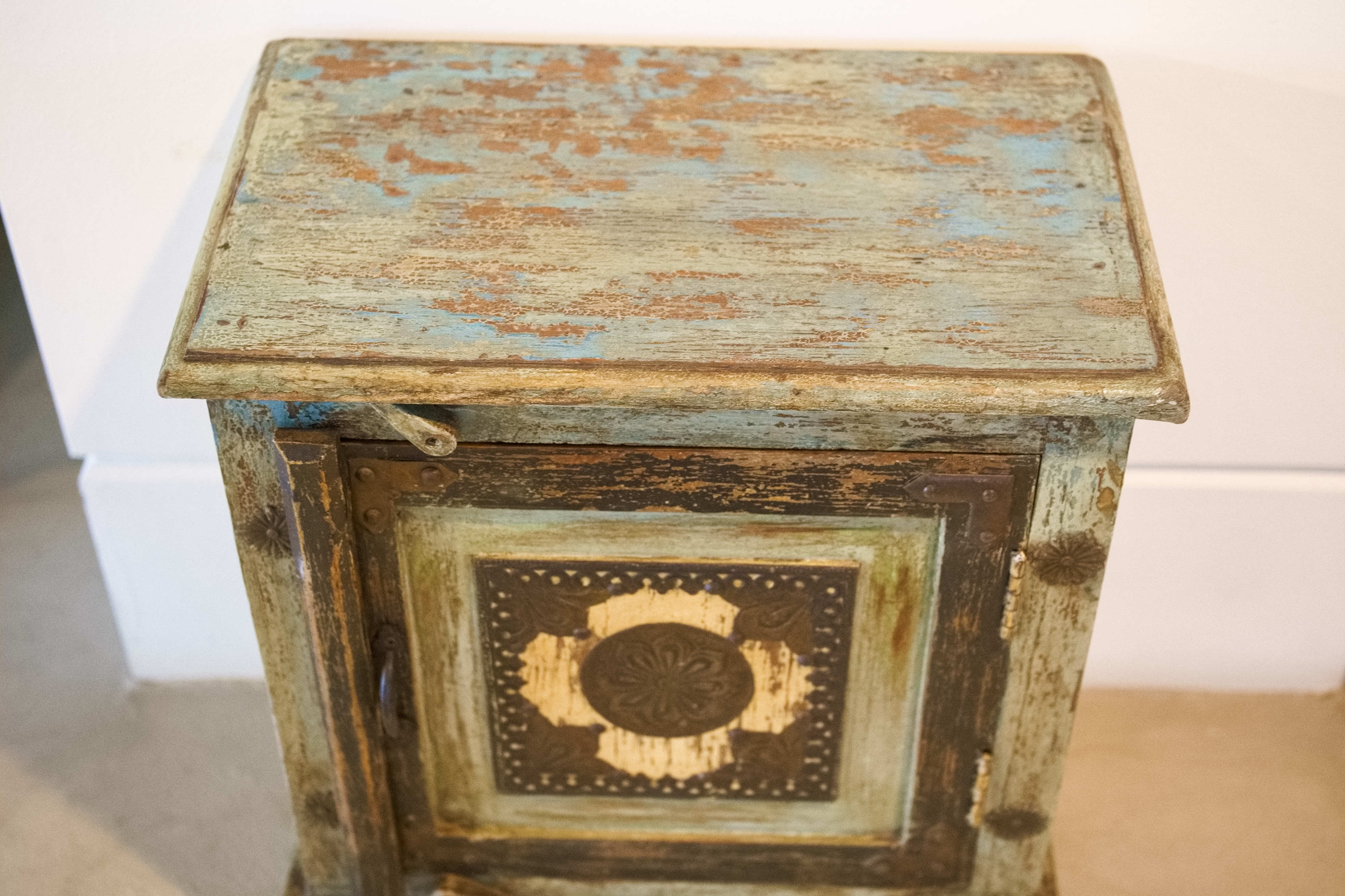 mobile indiano 1 anta costruito in legno di teak dipinto ed inciso mobile decorato a rilievo in pasta di gesso e con metallo cesellato a sbalzo
