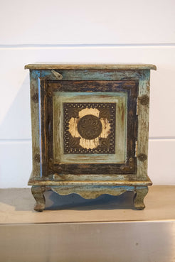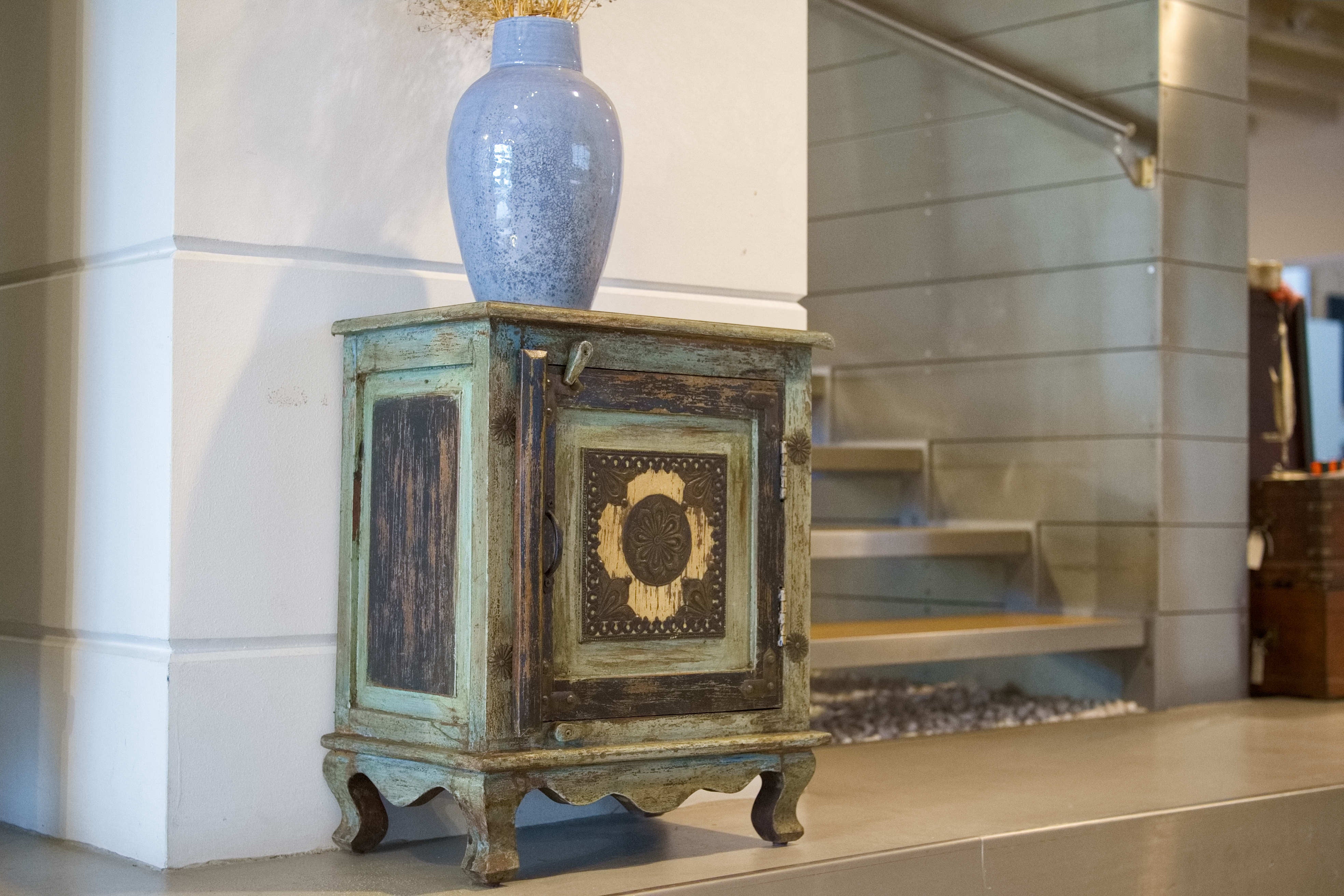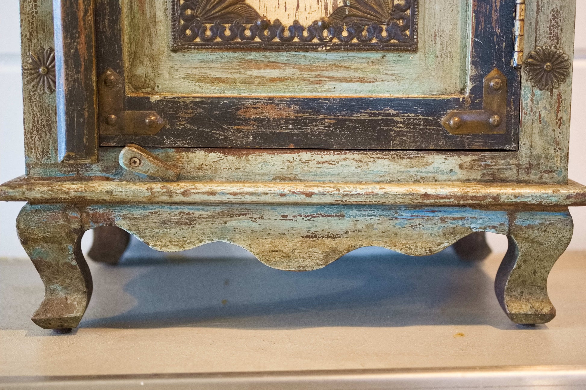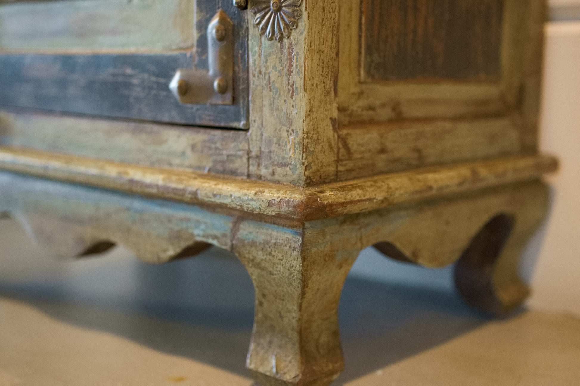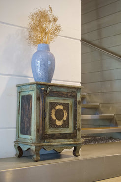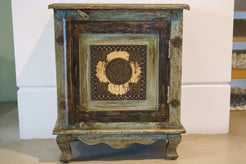 mobile indiano 1 anta costruito in legno di teak dipinto ed inciso mobile decorato a rilievo in pasta di gesso e con metallo cesellato a sbalzo