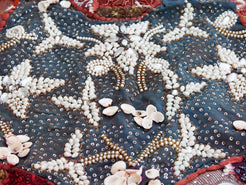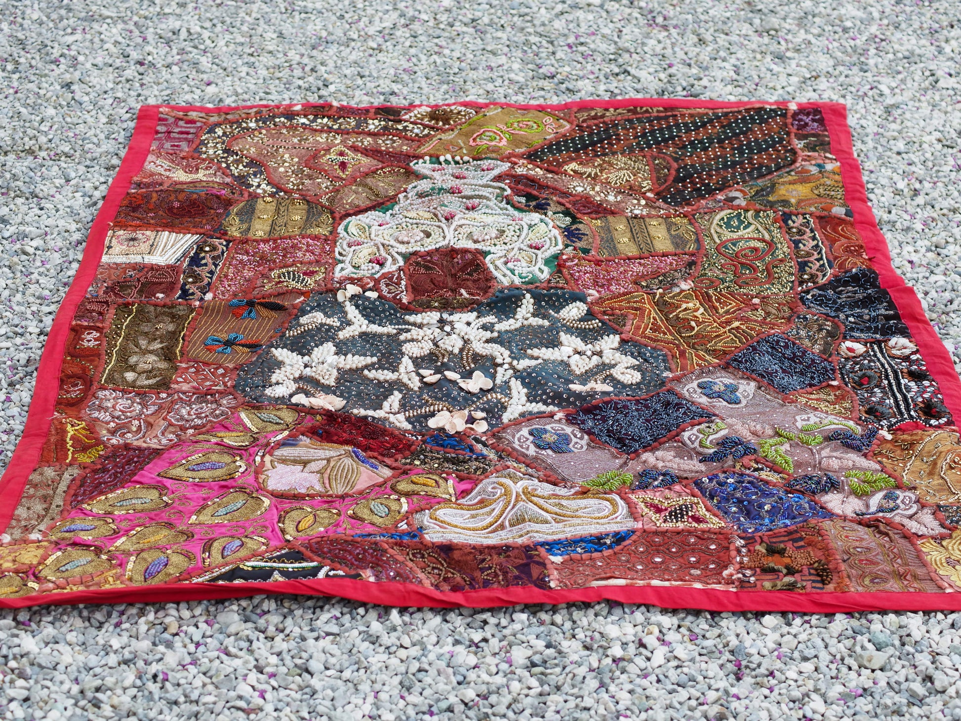 Vecchio arazzo in cotone con aggiunta di specchietti, perline e filo oro è lavorato artigianalmente a mano con tecnica patchwork.