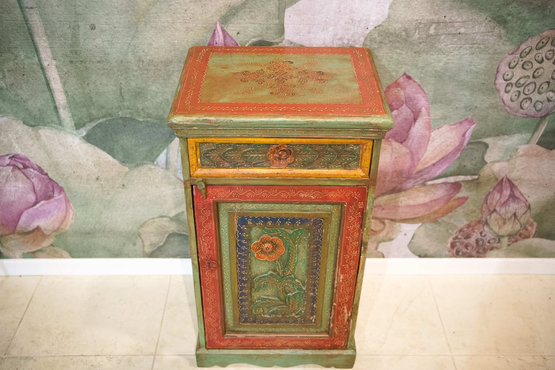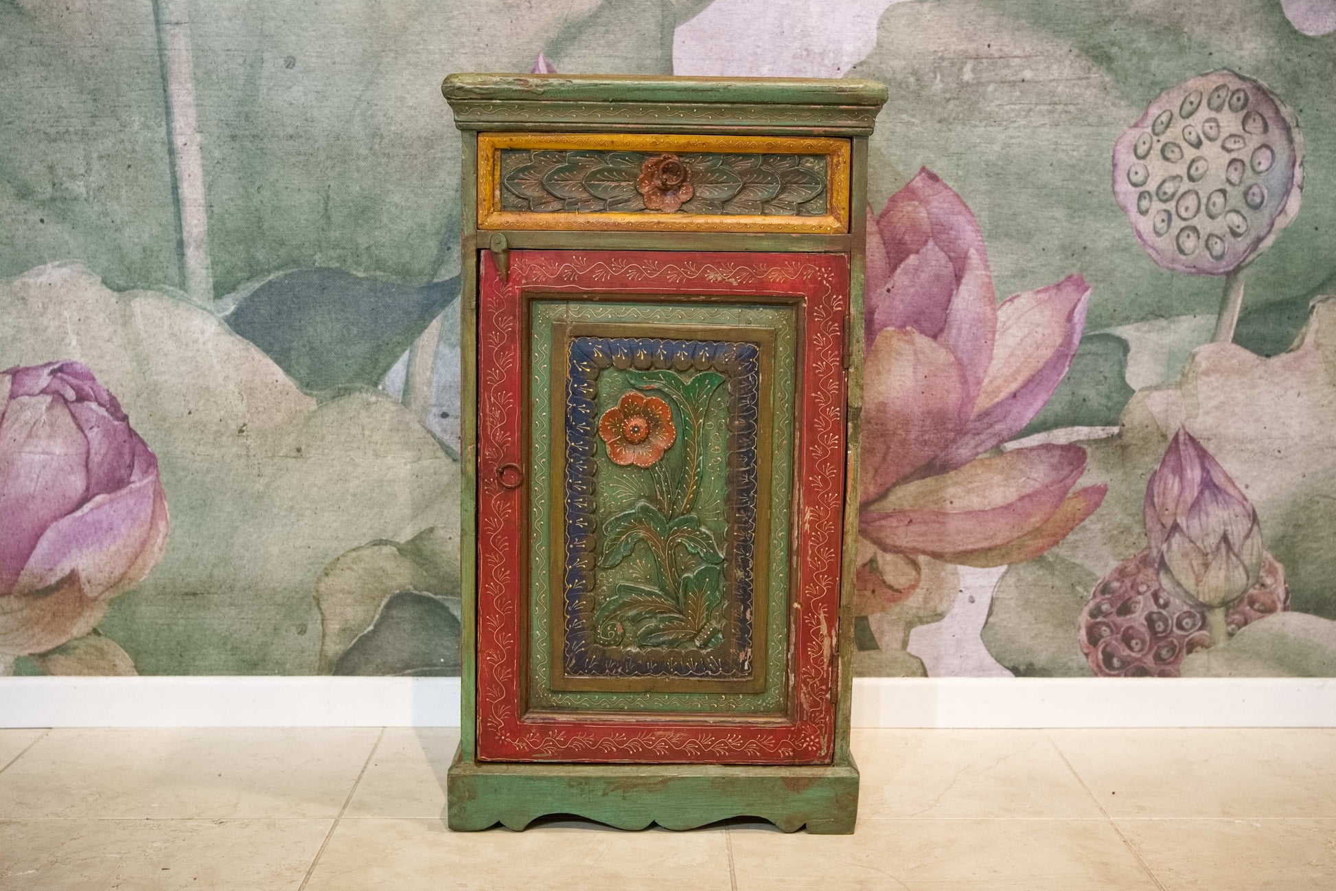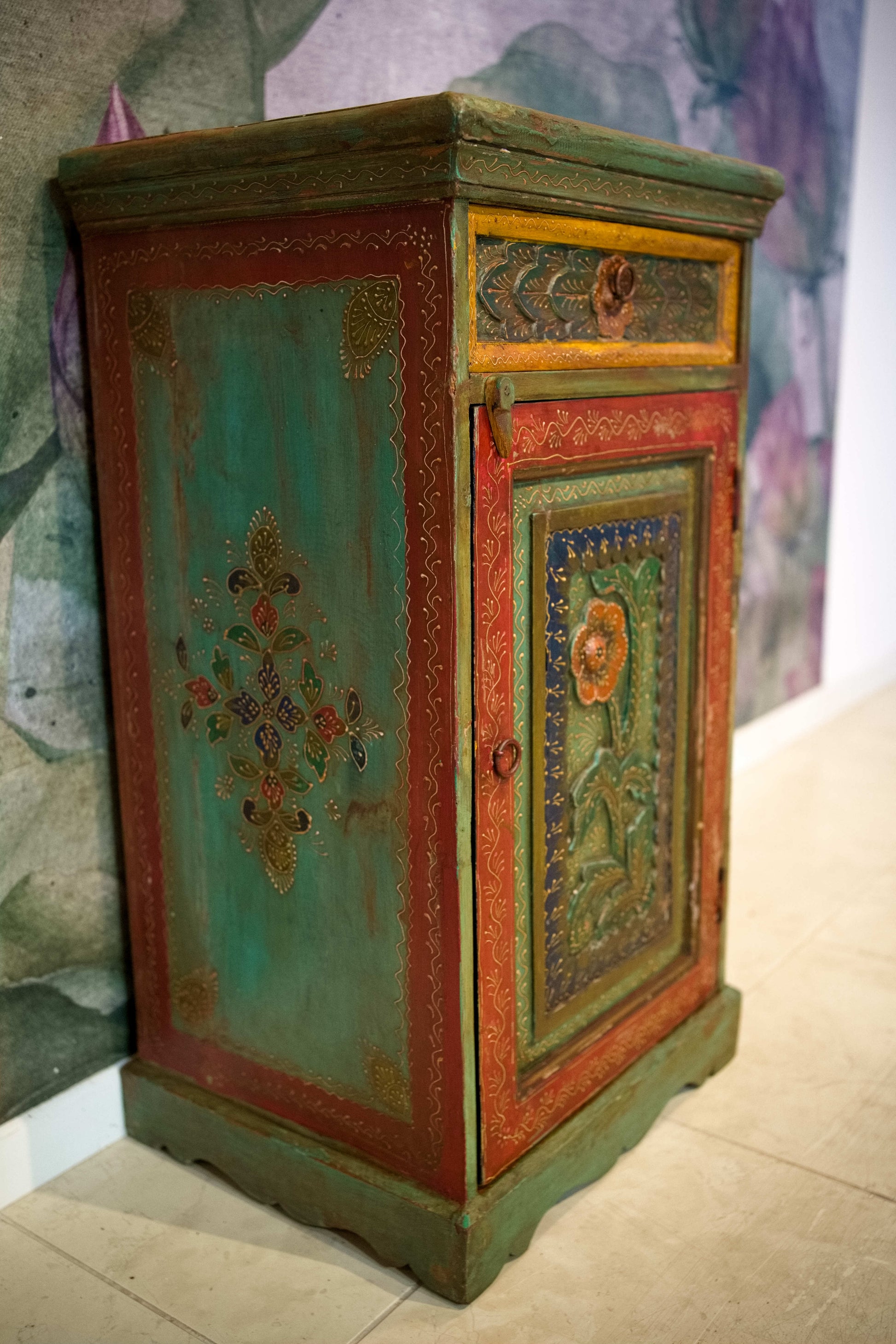 mobile indiano 1 anta 1 cassetto costruito in legno di teak dipinto ed inciso mobile decorato a rilievo in pasta di gesso