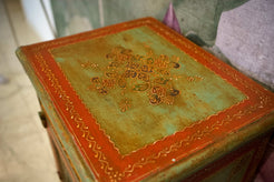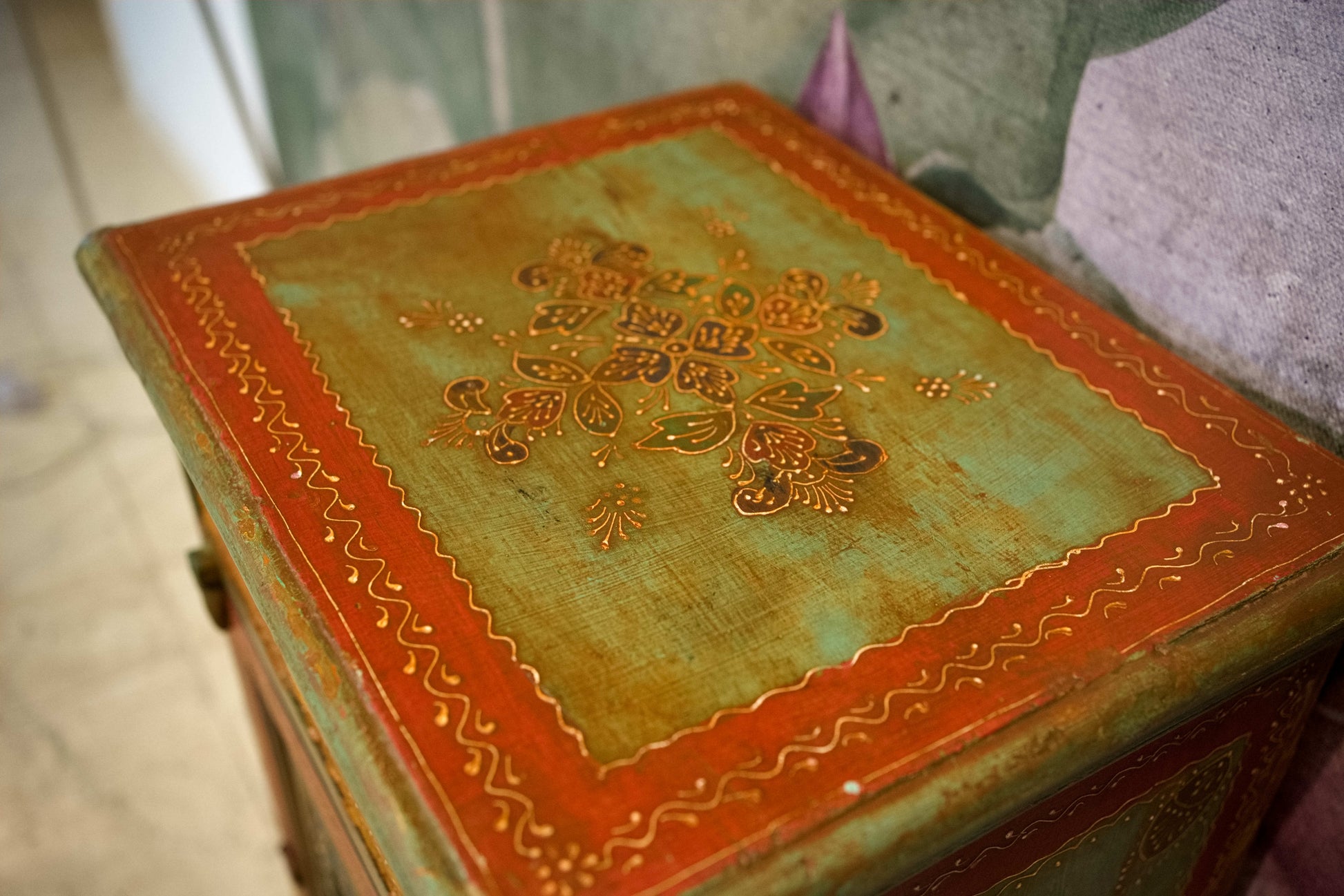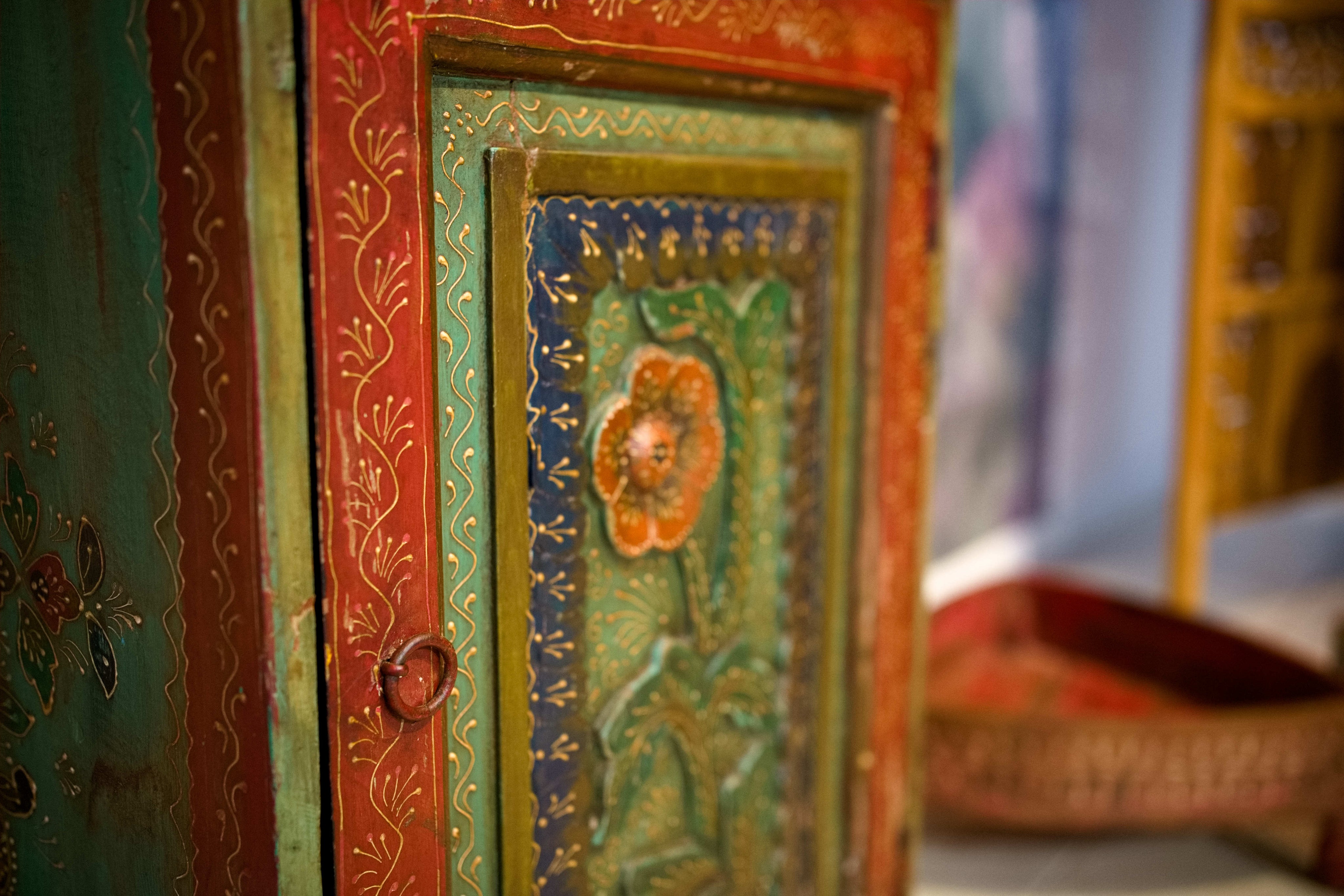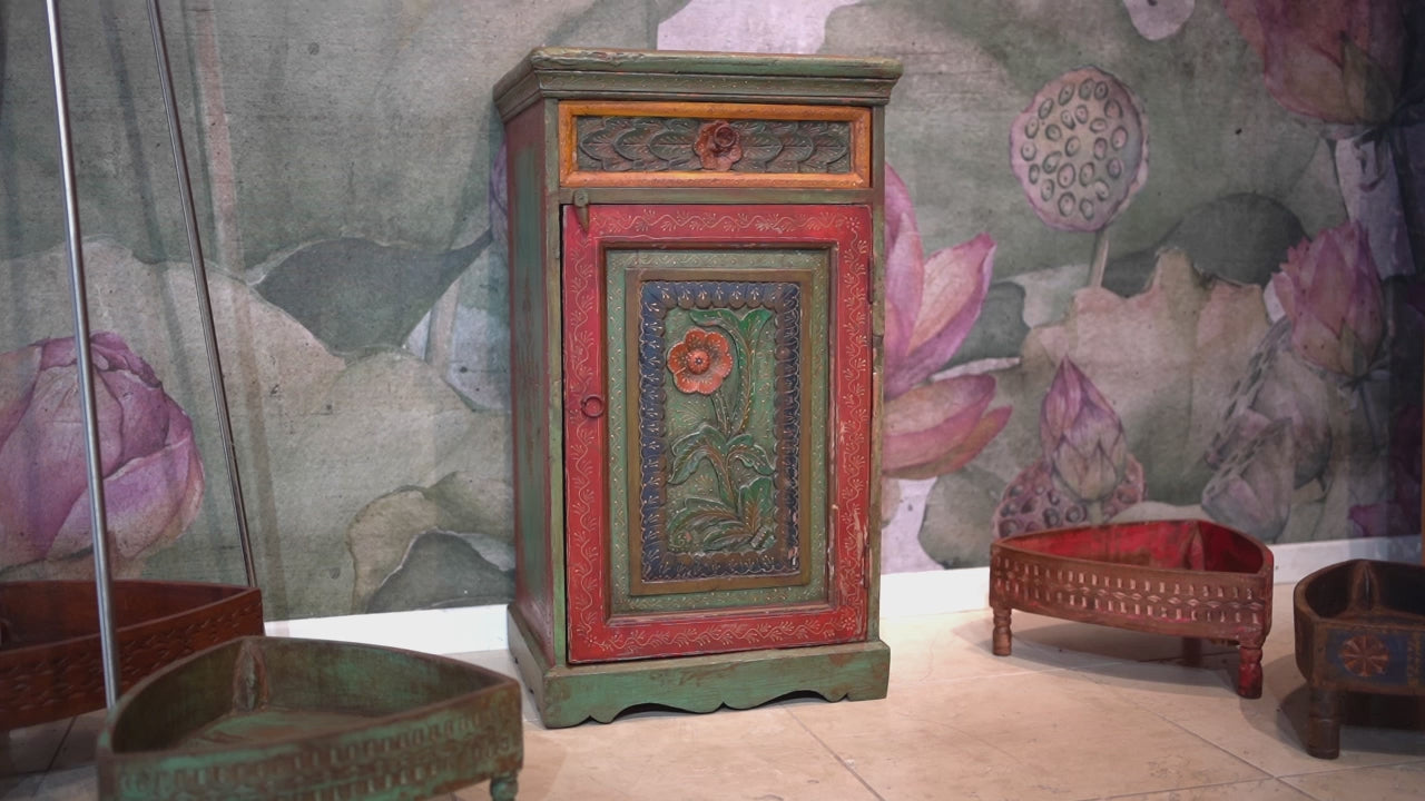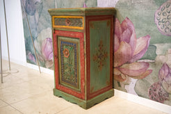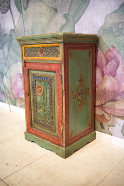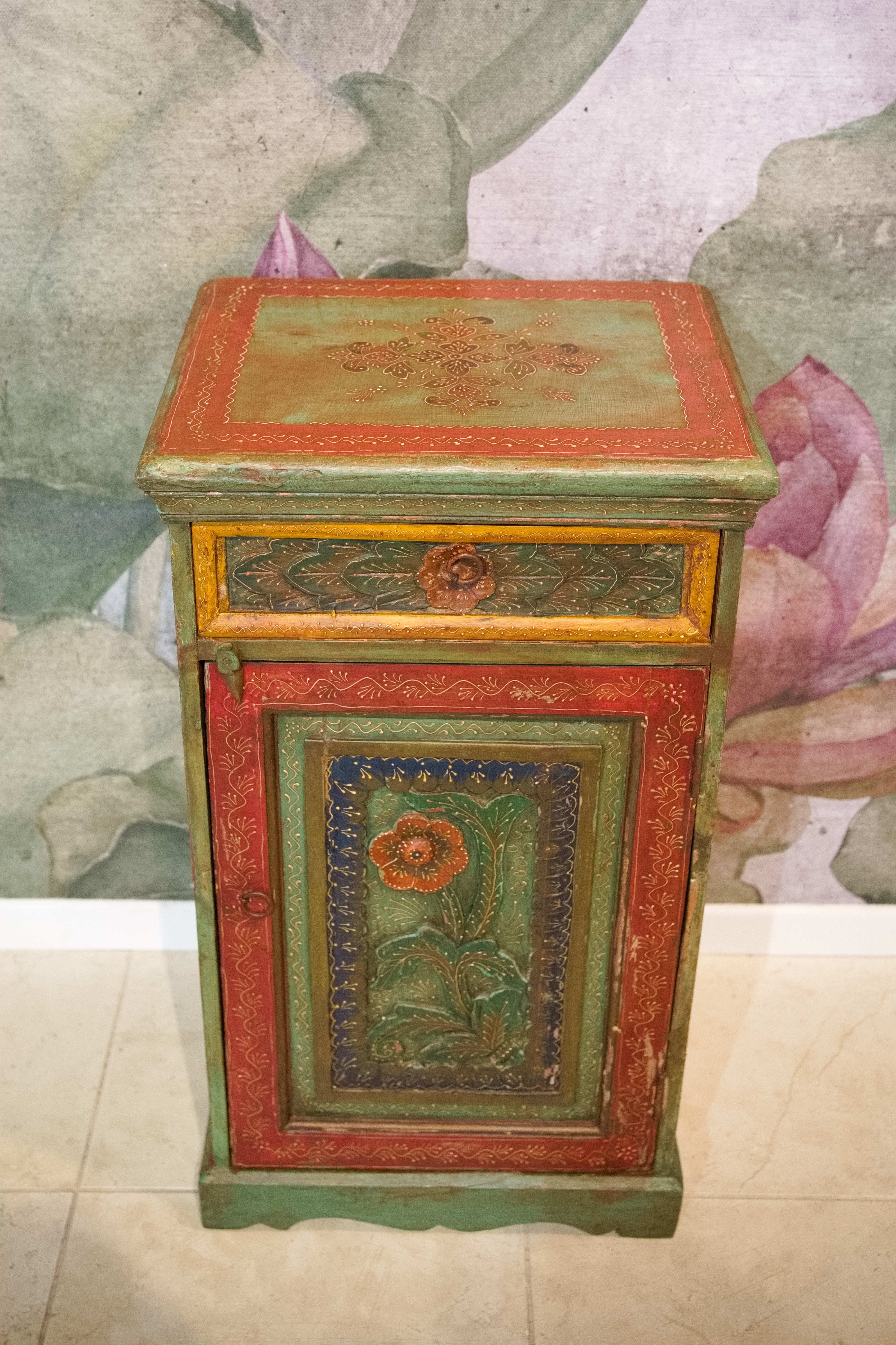 mobile indiano 1 anta 1 cassetto costruito in legno di teak dipinto ed inciso mobile decorato a rilievo in pasta di gesso
