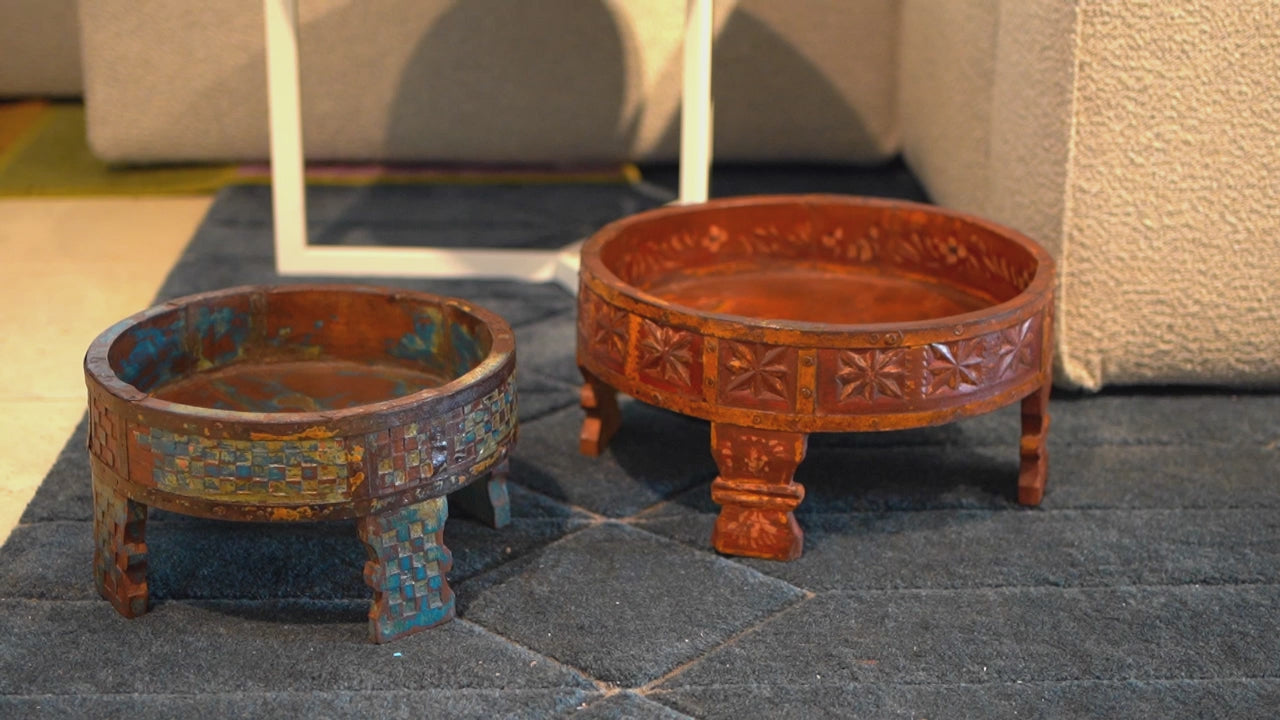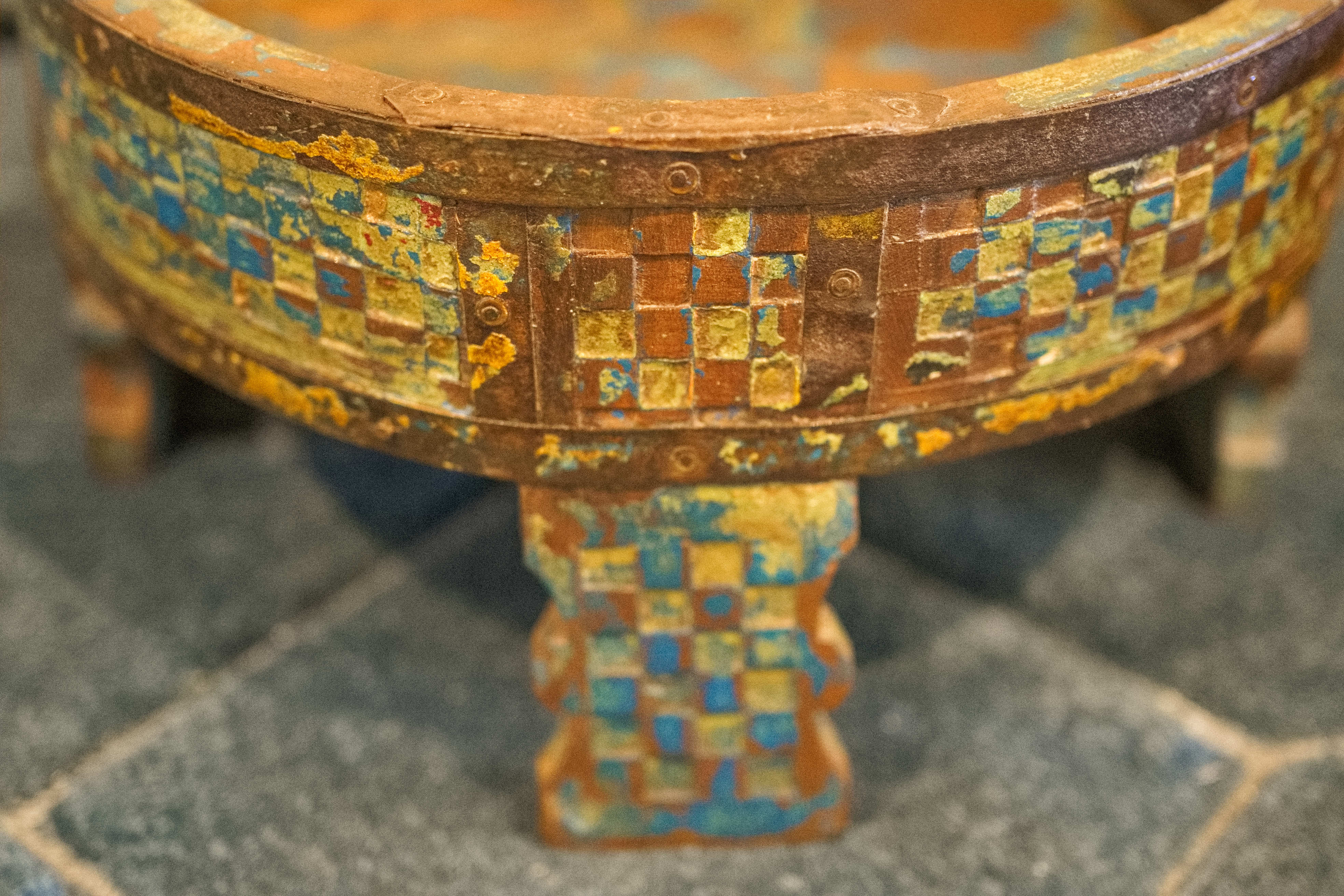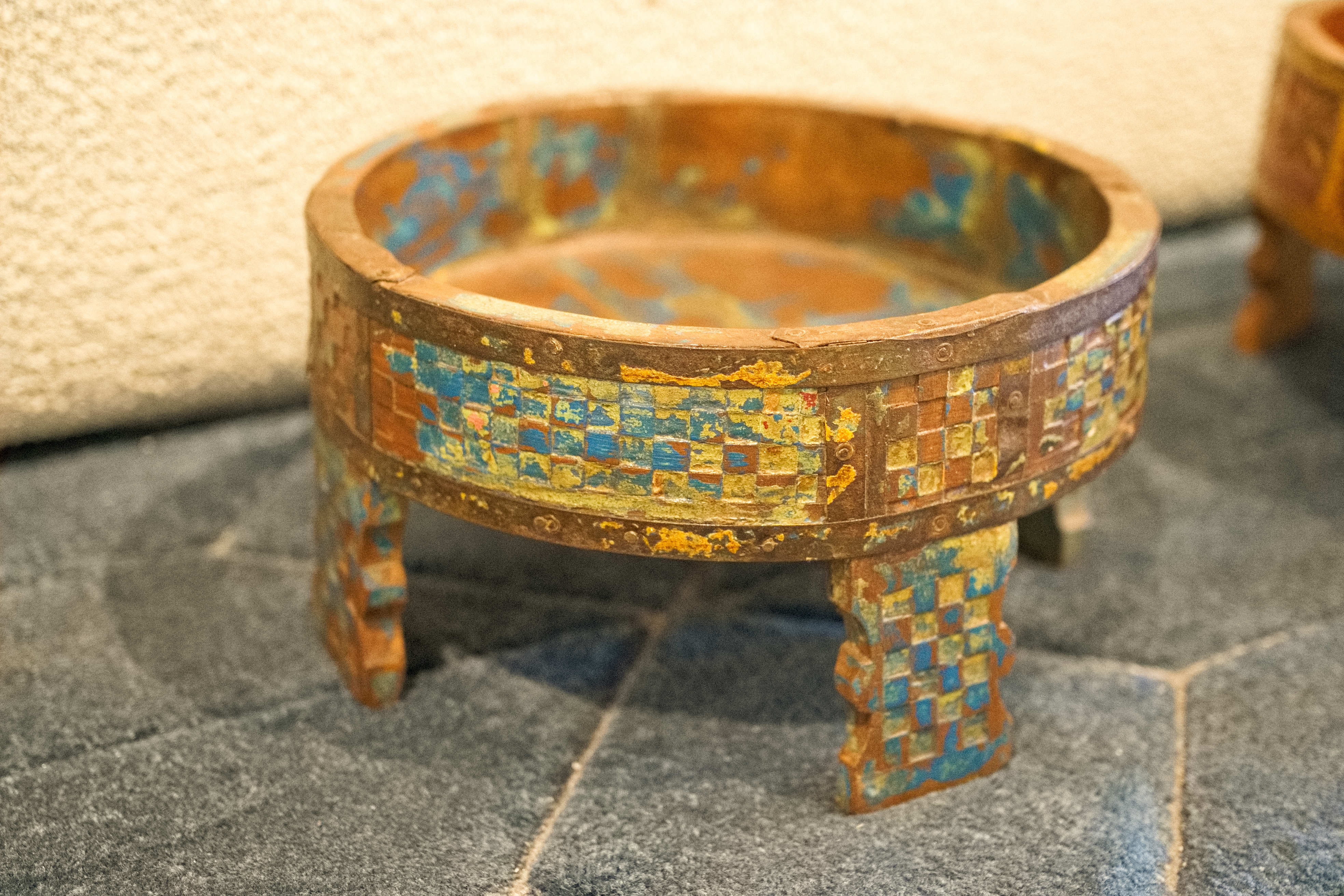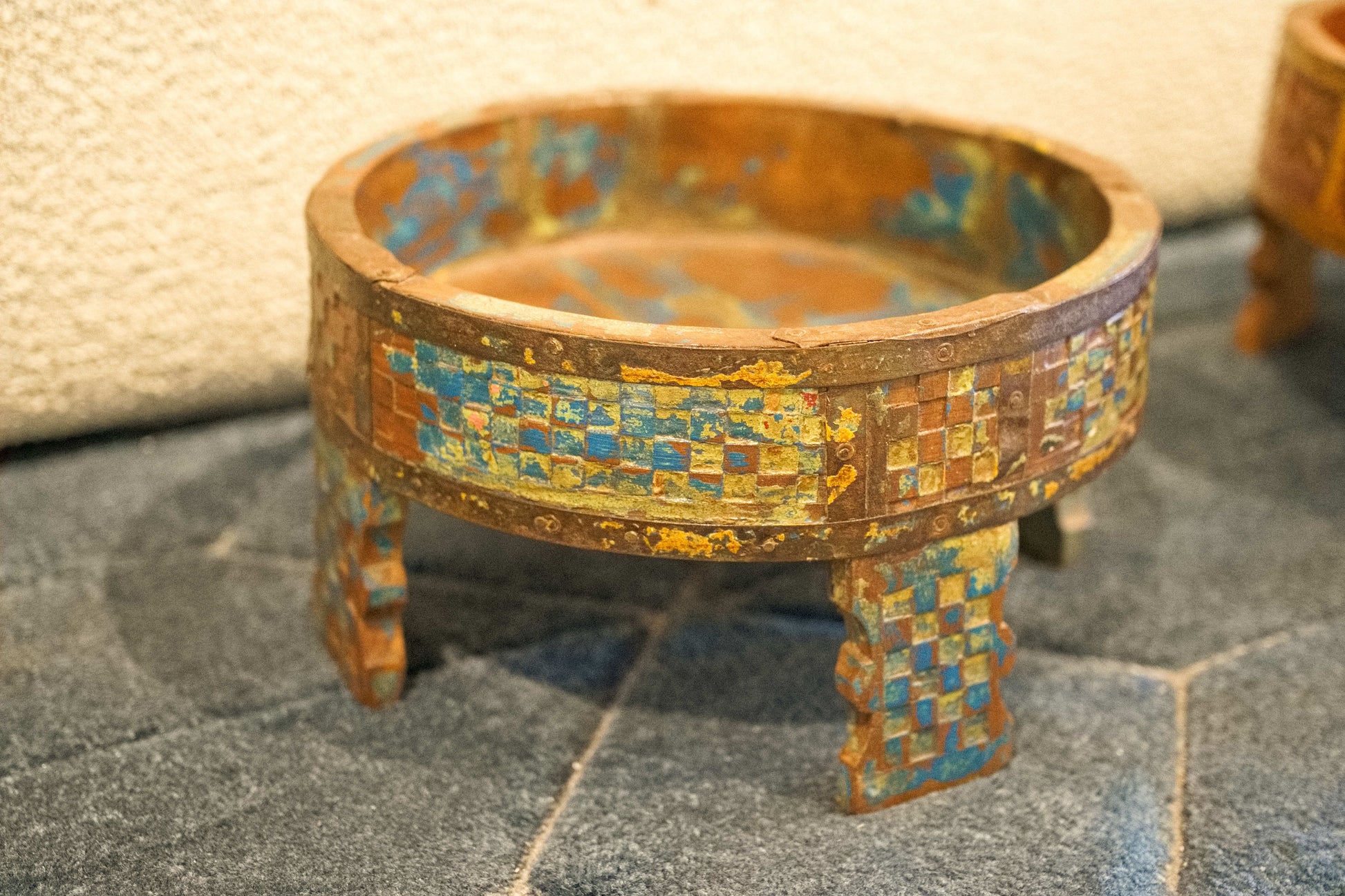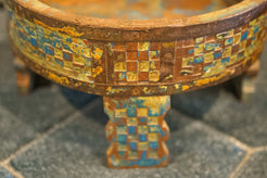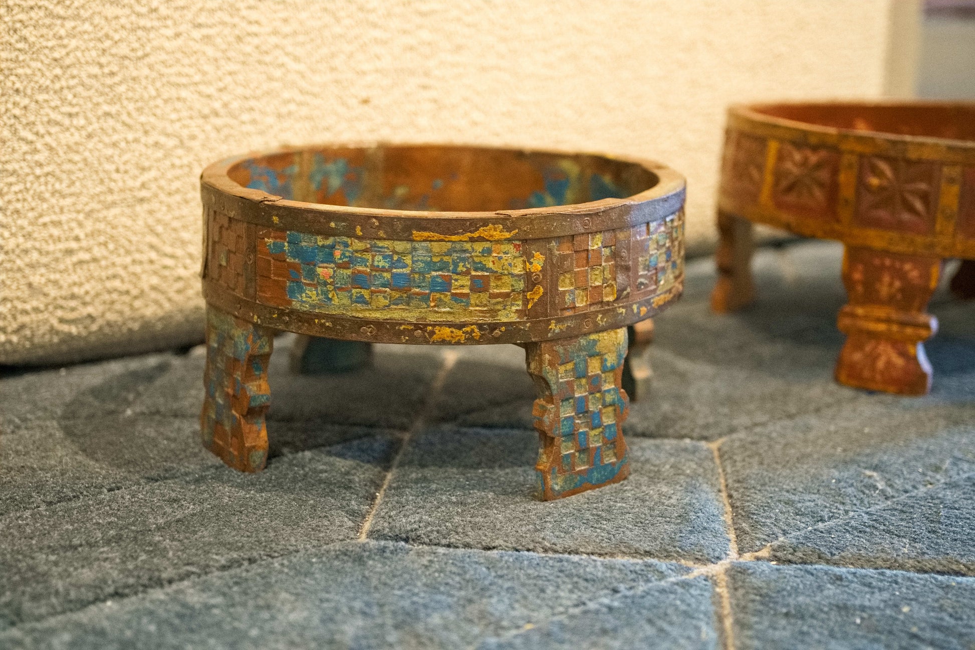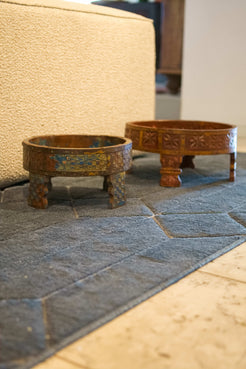 Vecchia macina, mortaio indiano in radice di teak massello inciso, impiegate in origine come macine per cereali ed essicatoio.