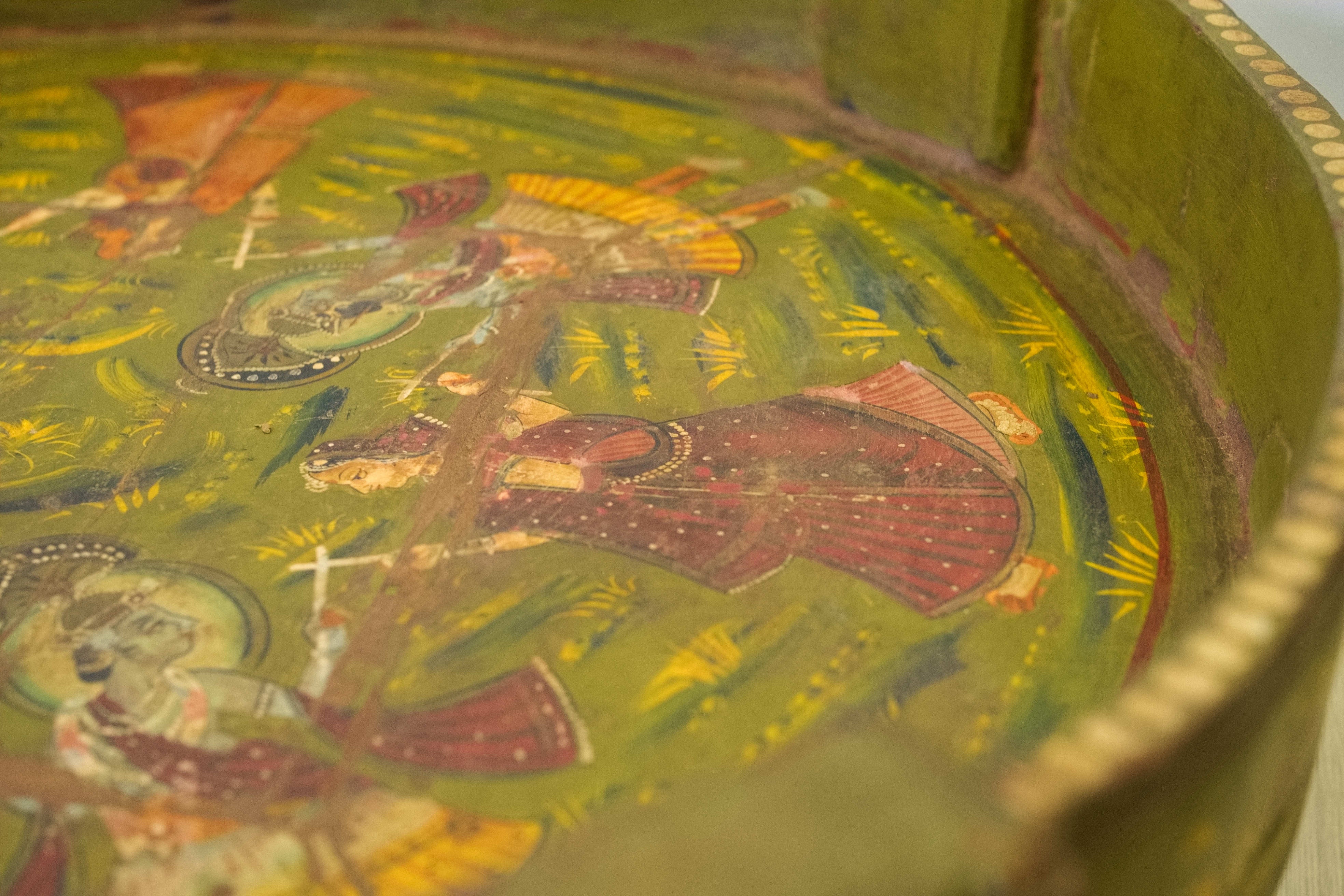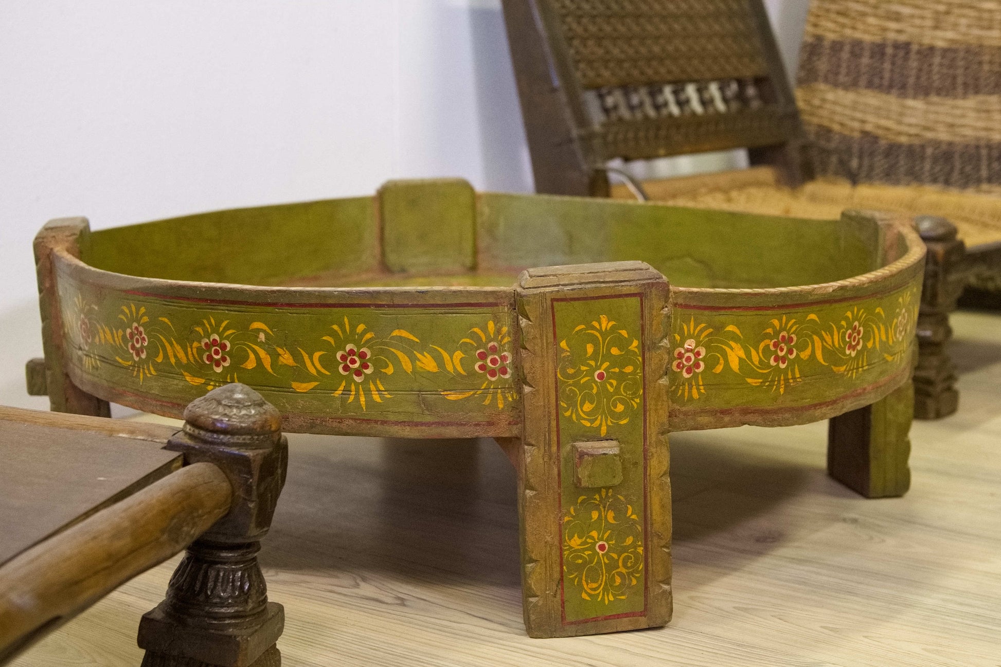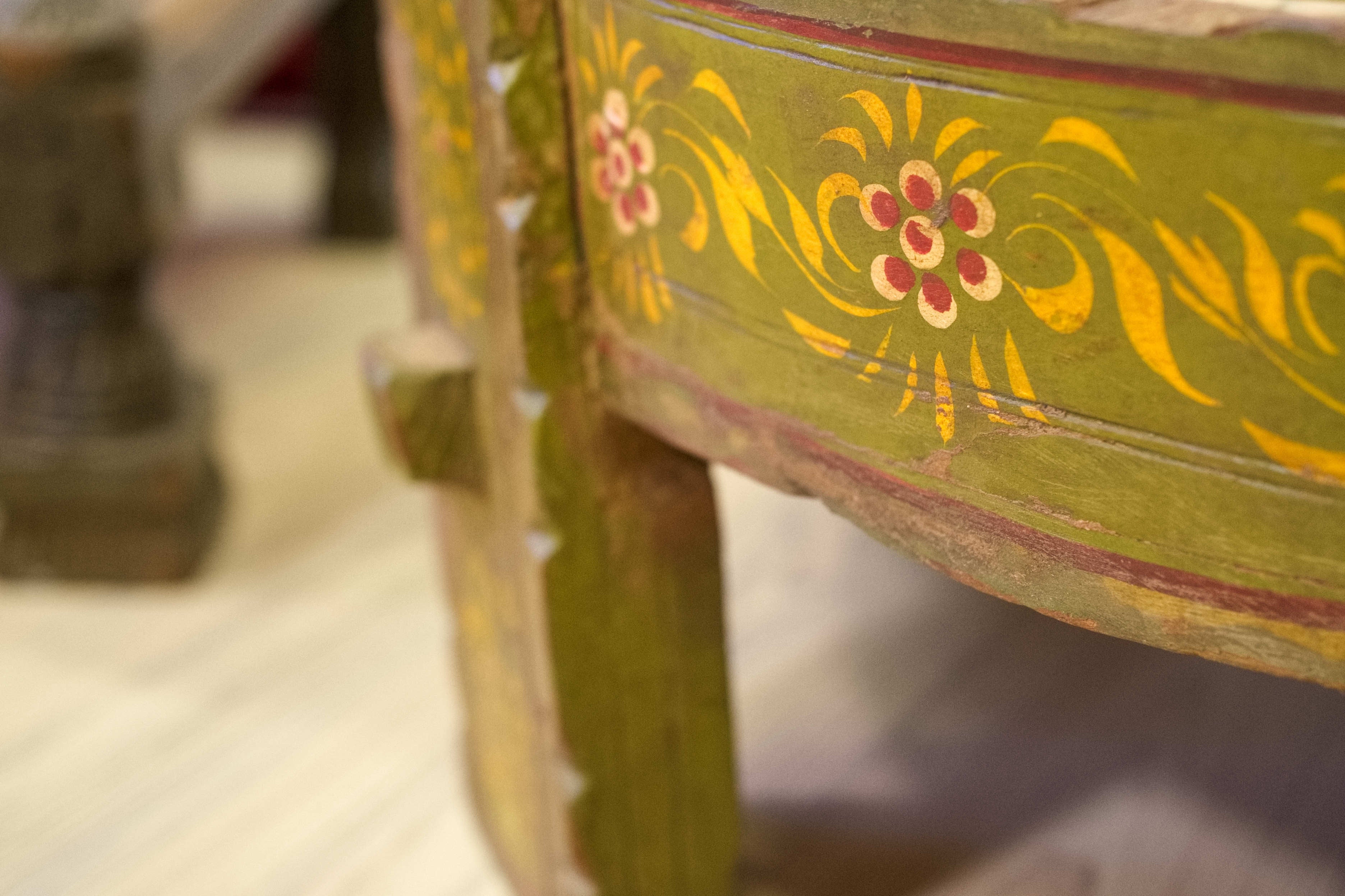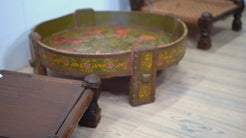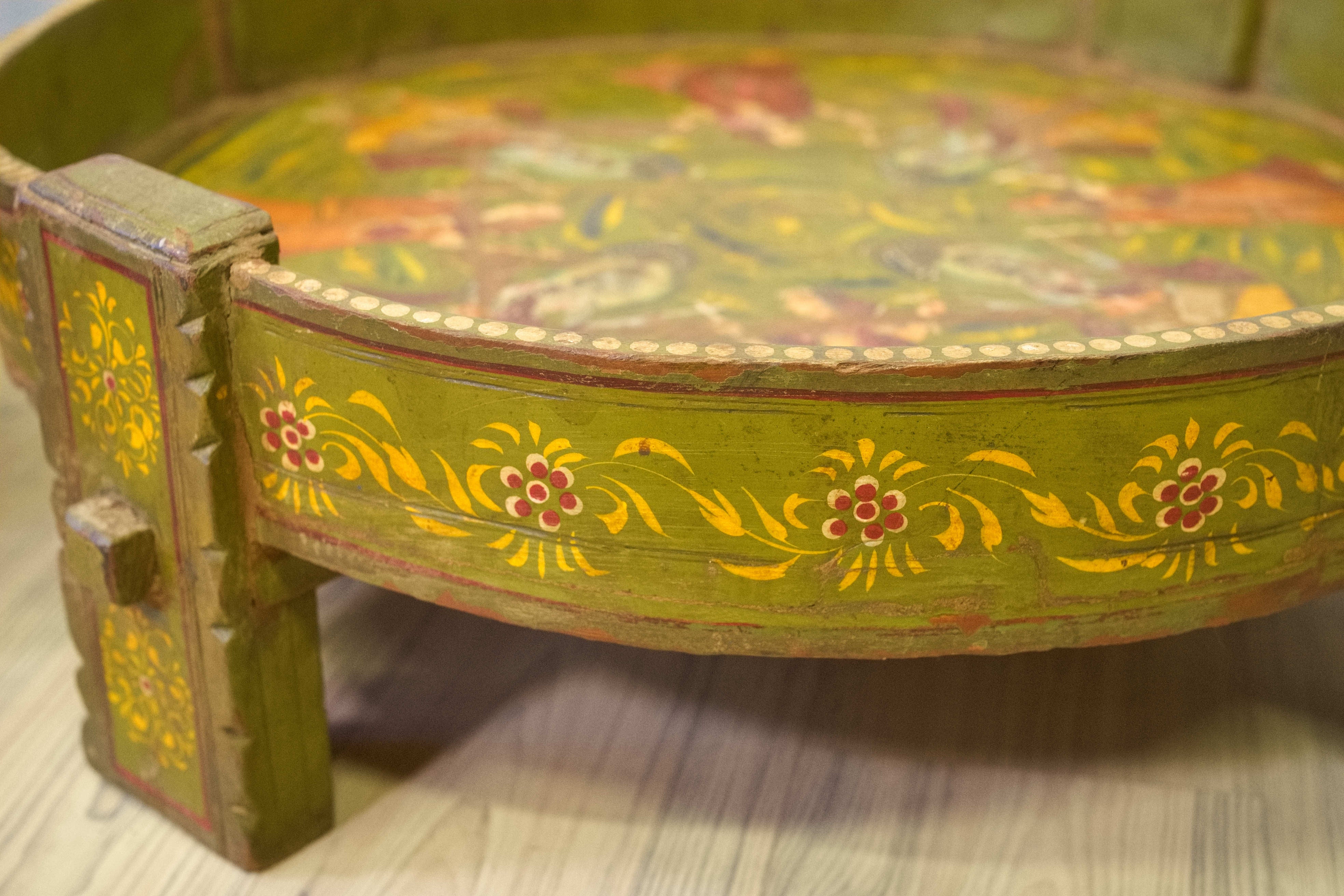 macina, mortaio indiano in metallo dipinto con motivi floreali, impiegate in origine come macine per cereali ed essicatoio.