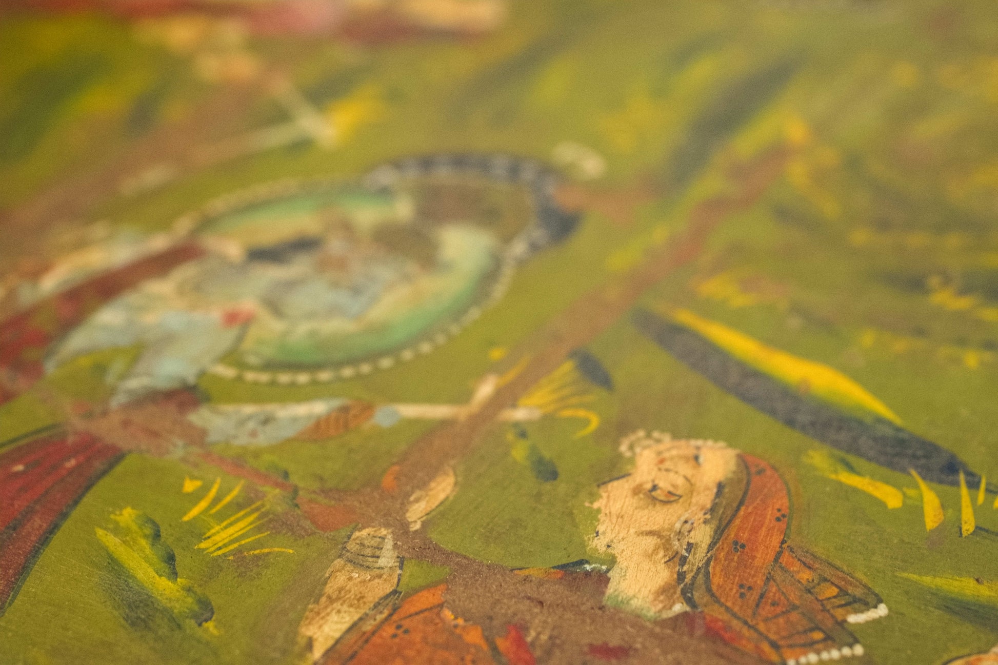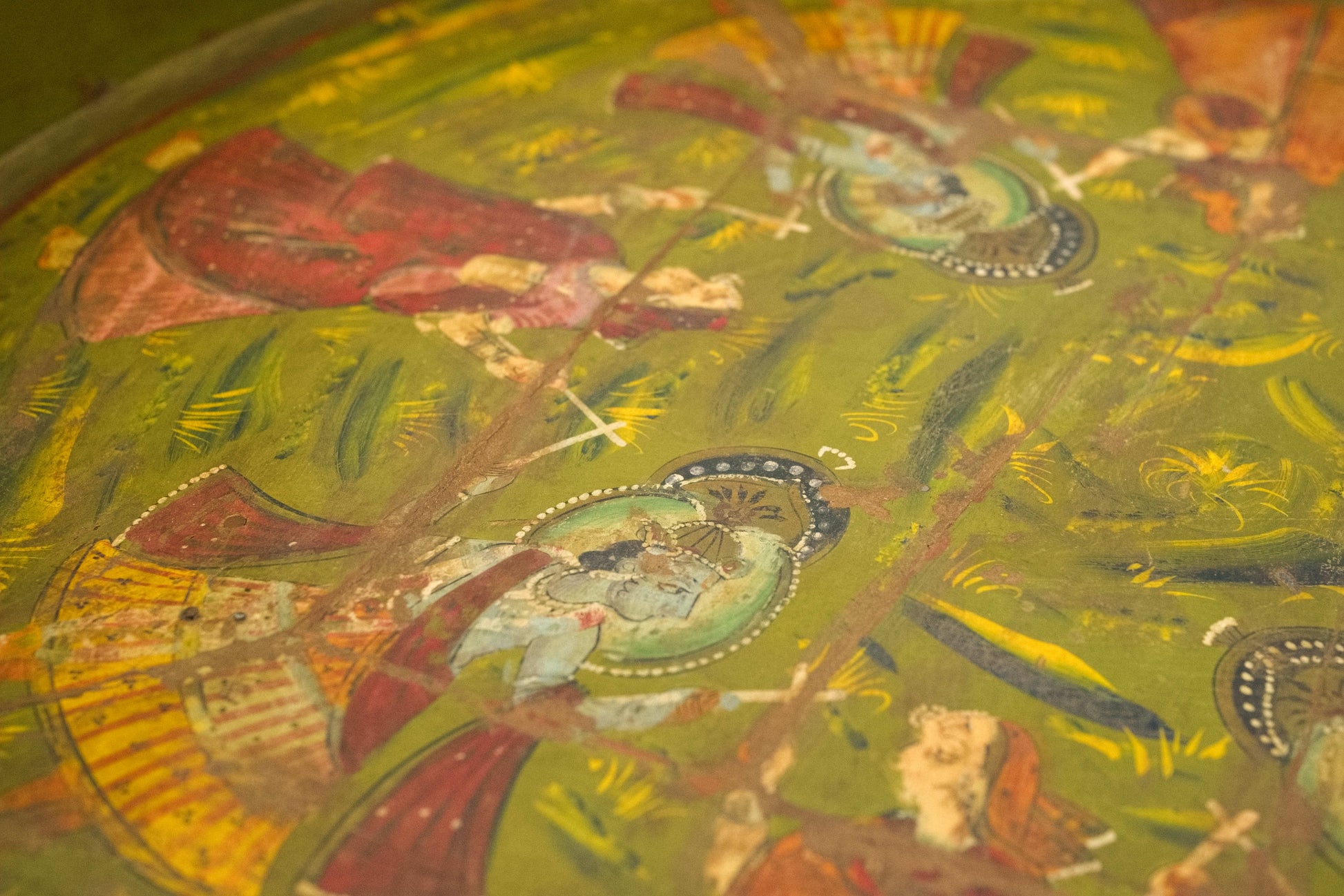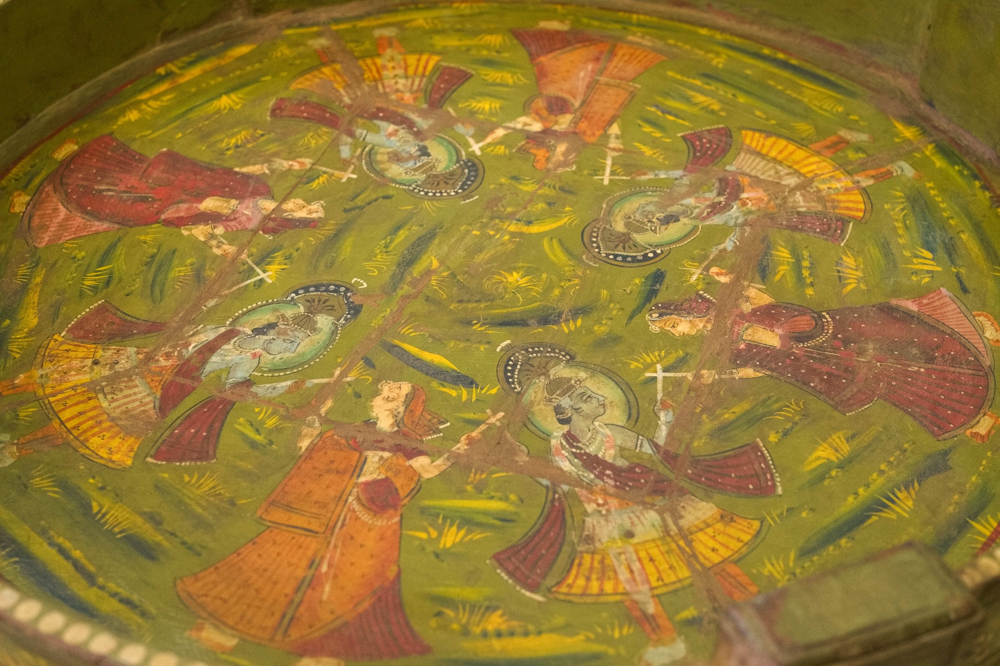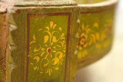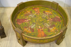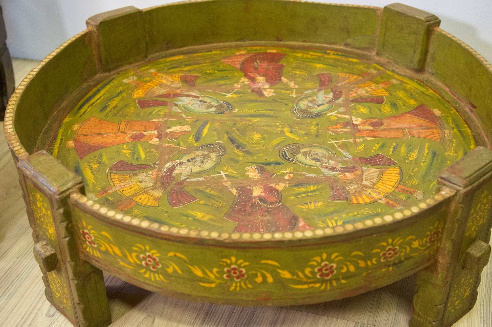 macina, mortaio indiano in metallo dipinto con motivi floreali, impiegate in origine come macine per cereali ed essicatoio.