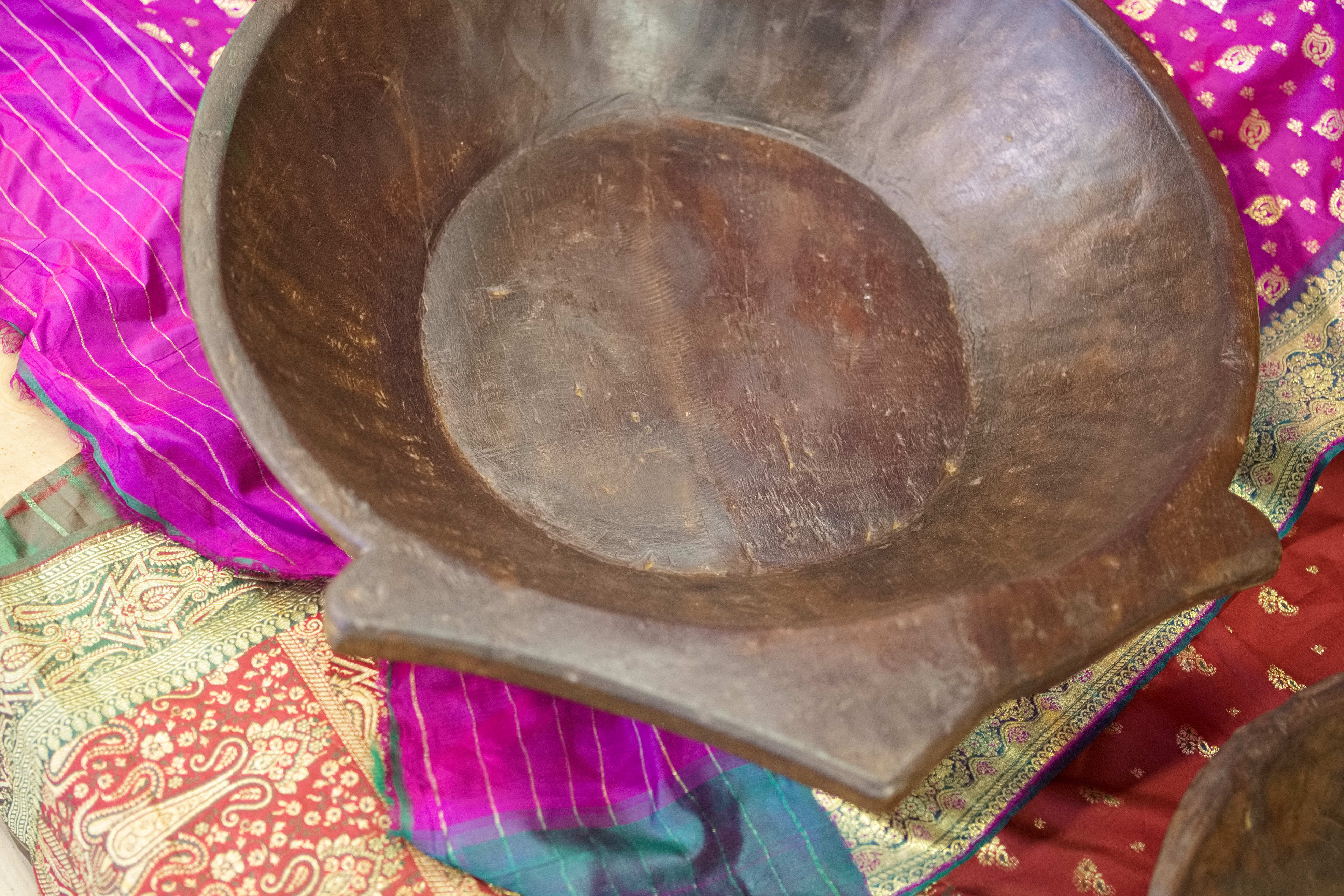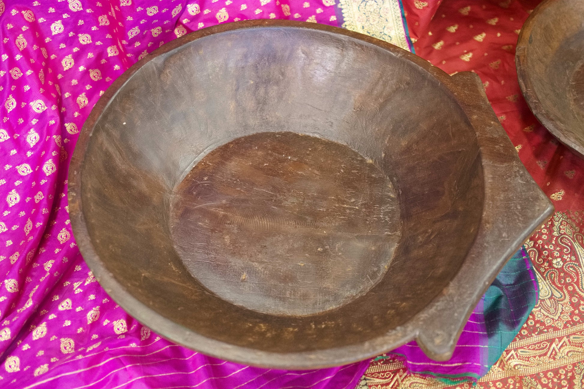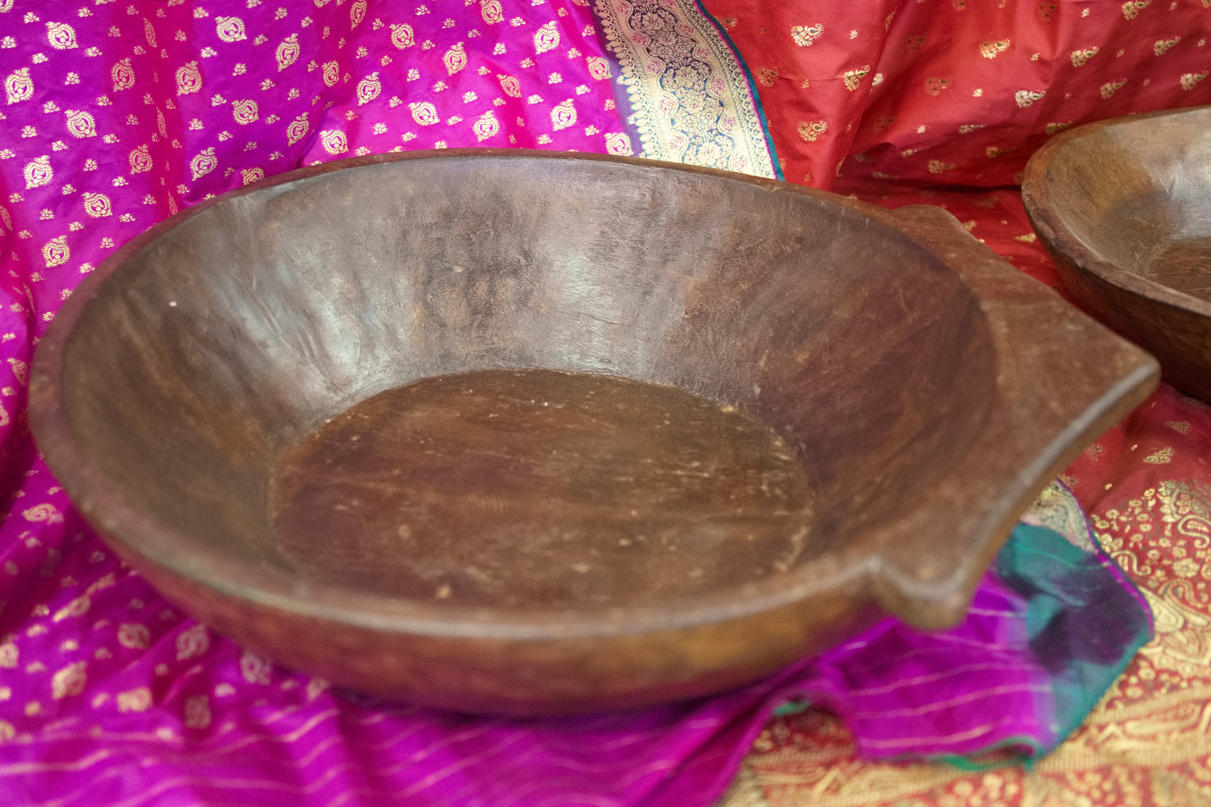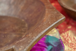 piatto in legno con manico ricavato da un unico tronco di legno. usato in principio come piatto , setaccio per esiccare i cereali tronco unico di teak massello databile inizio / metà 900