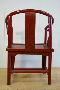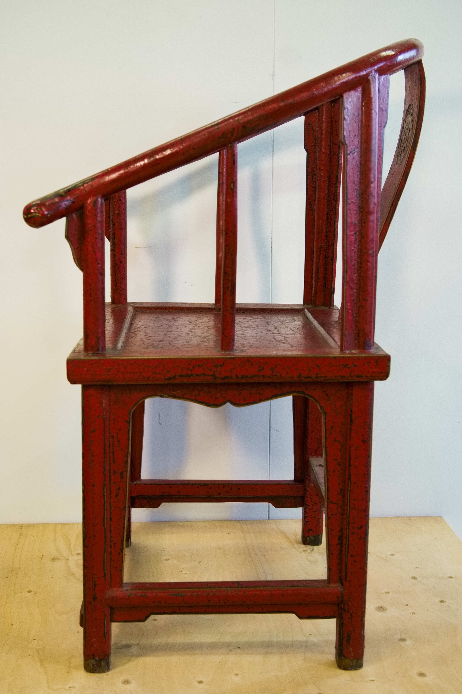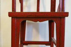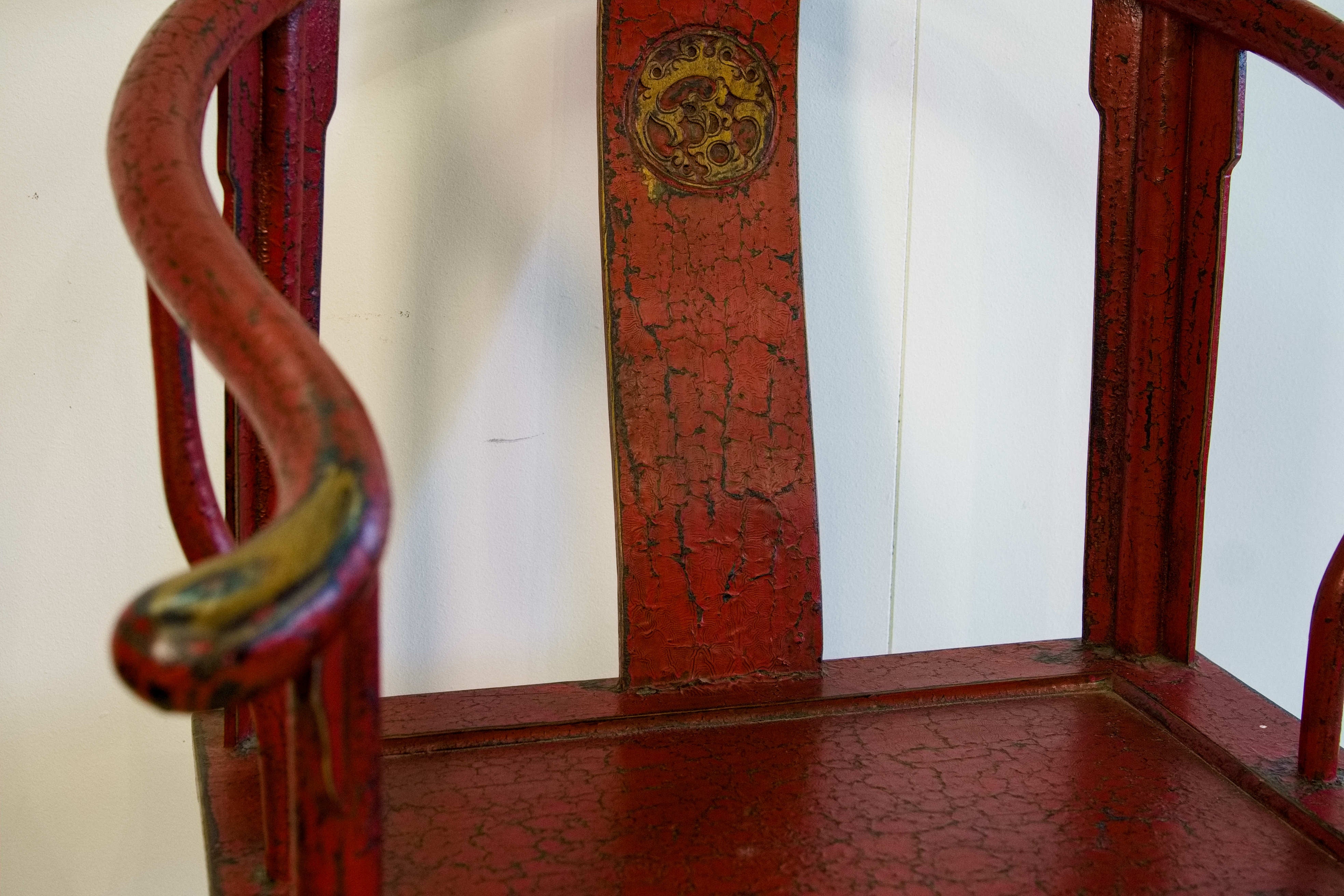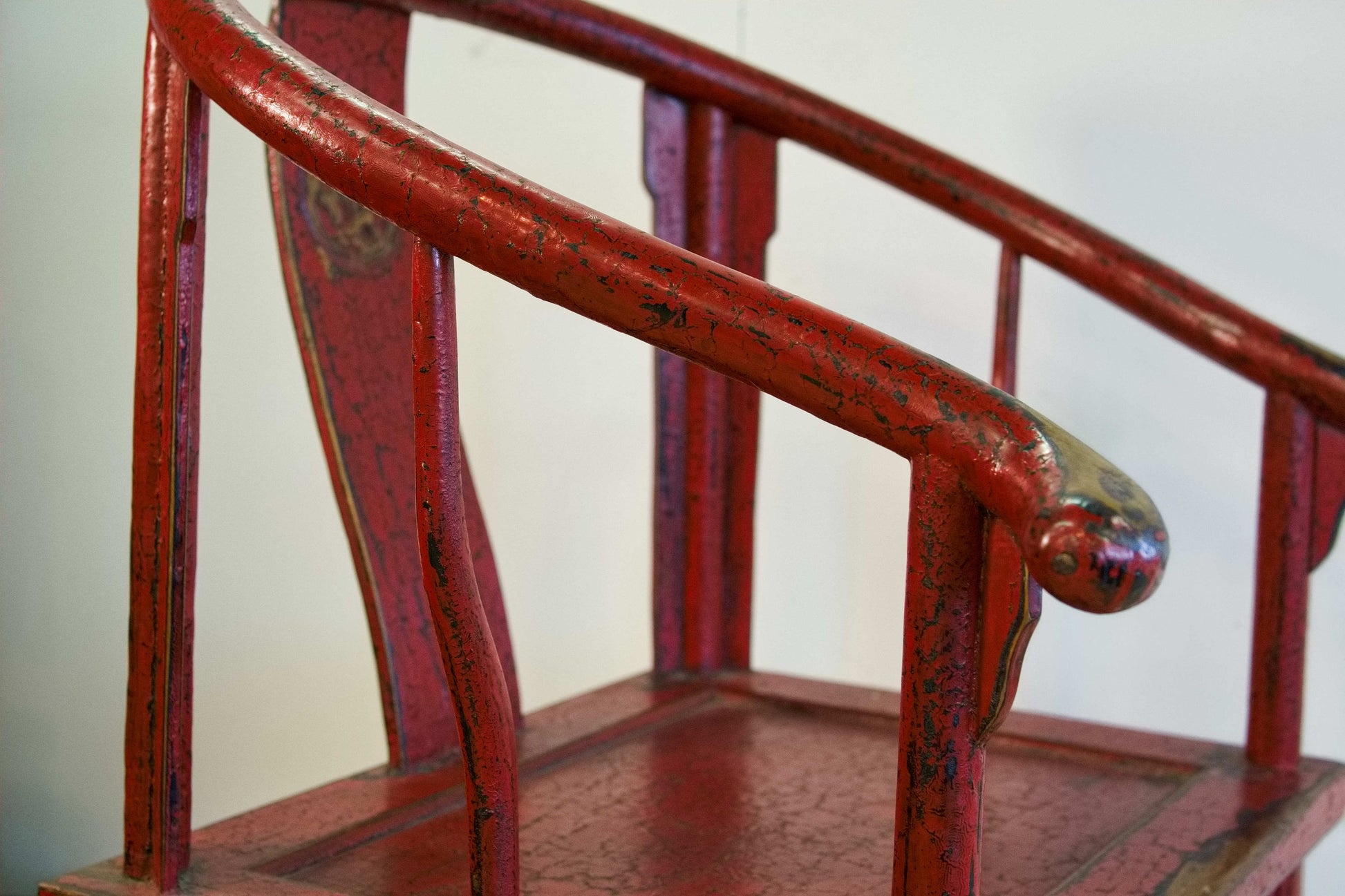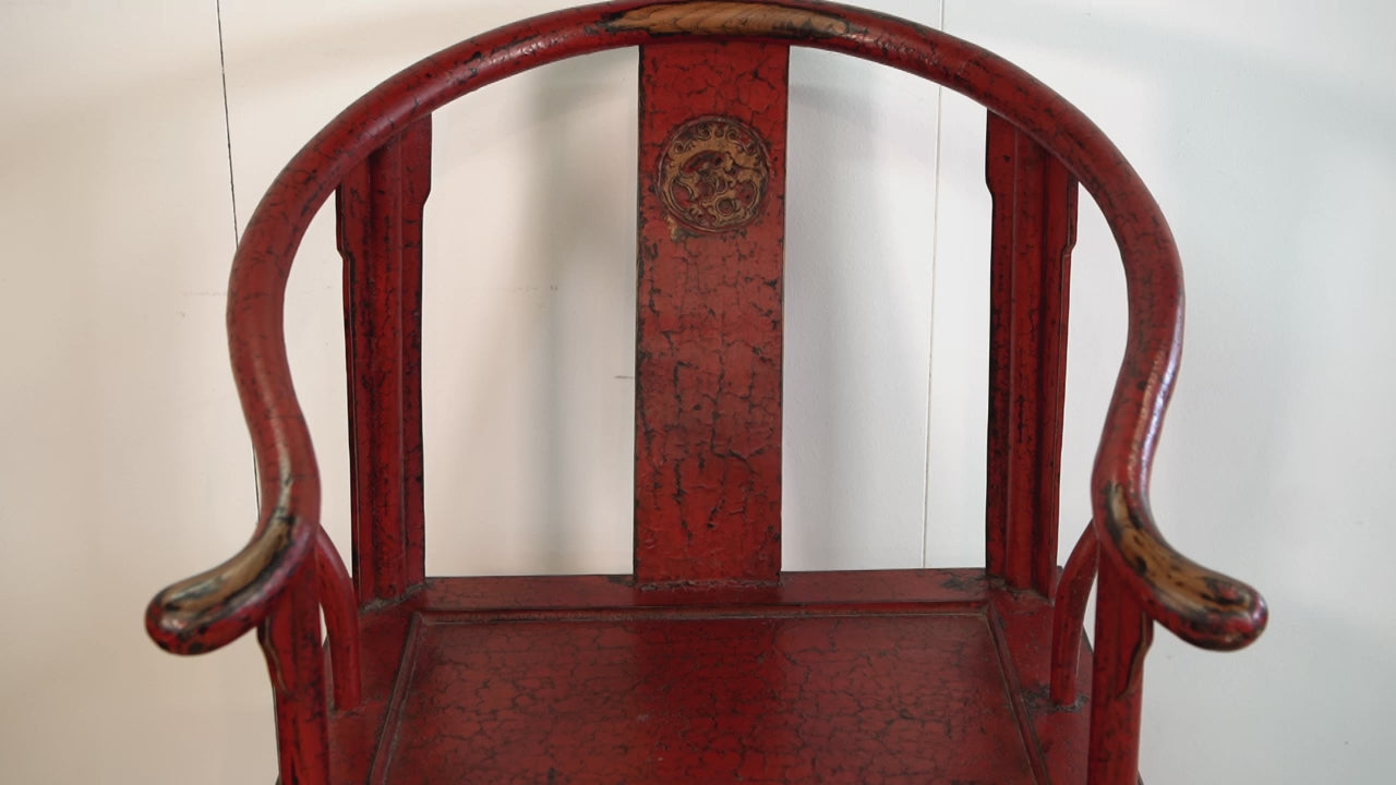 Trono Cinese Laccato Rosso, In Legno Di Olmo Curvato A Vapore Ed Assemblato Ad Incastro. Pezzo Unico Molto Raro E In Ottimo Stato Di Conservazione, Tutte Le Parti Sono Originali, Dalle Incisioni Ai Piccoli Pezzi Di Legno Per Sostenere I Braccioli. Databile Metà '900. Proveniente Dalla Regione Dello Shanxi. Dimensioni 65x51xh106cm.