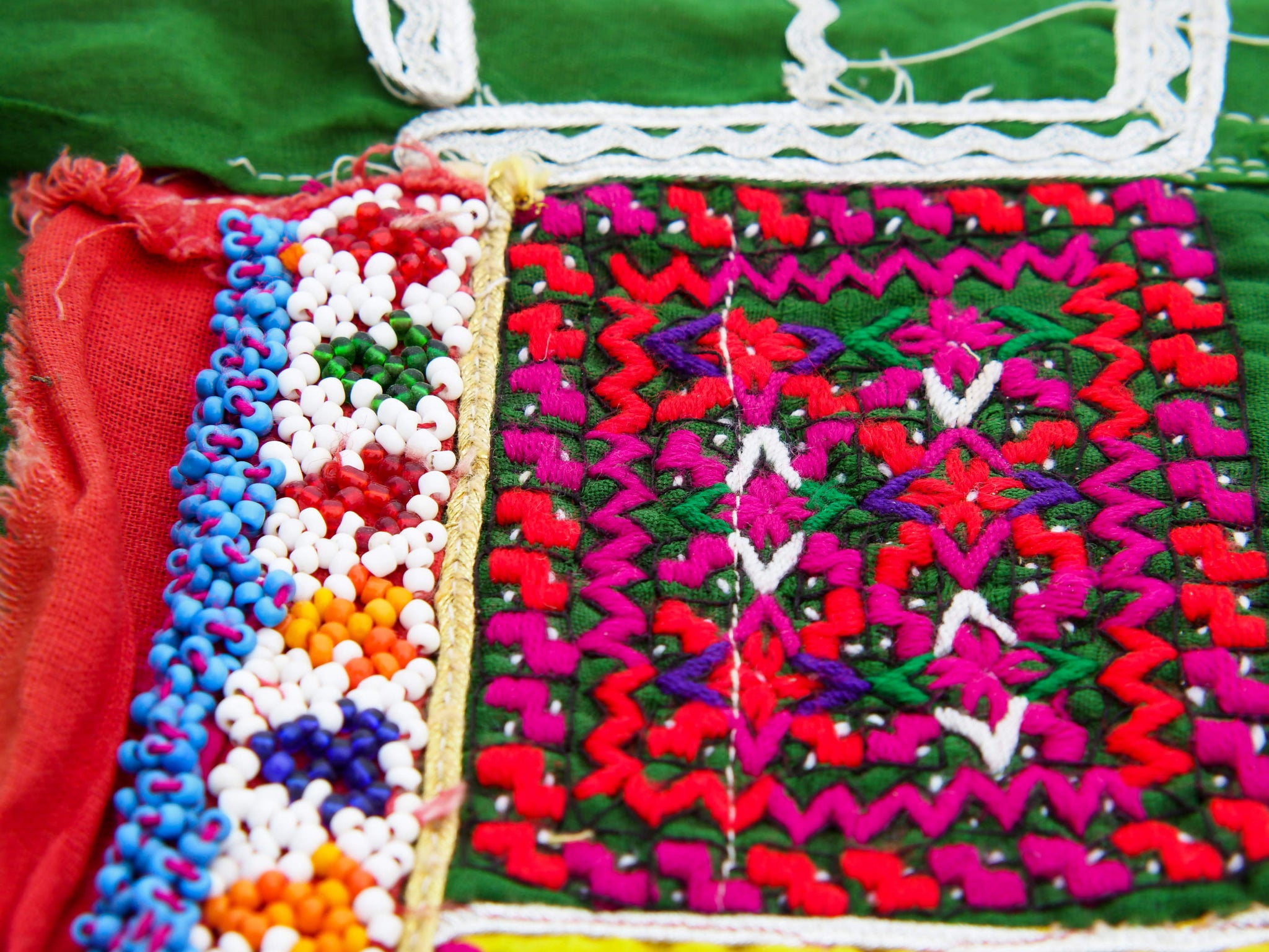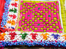 vecchio tessuto indiano ricamato, pezzo unico lavorato a mano in ogni parte con filo cotone, filo argento e perline . tipico del gujarat, usato come decoro ed addobbo. Può essere impiegato anche come toppa..